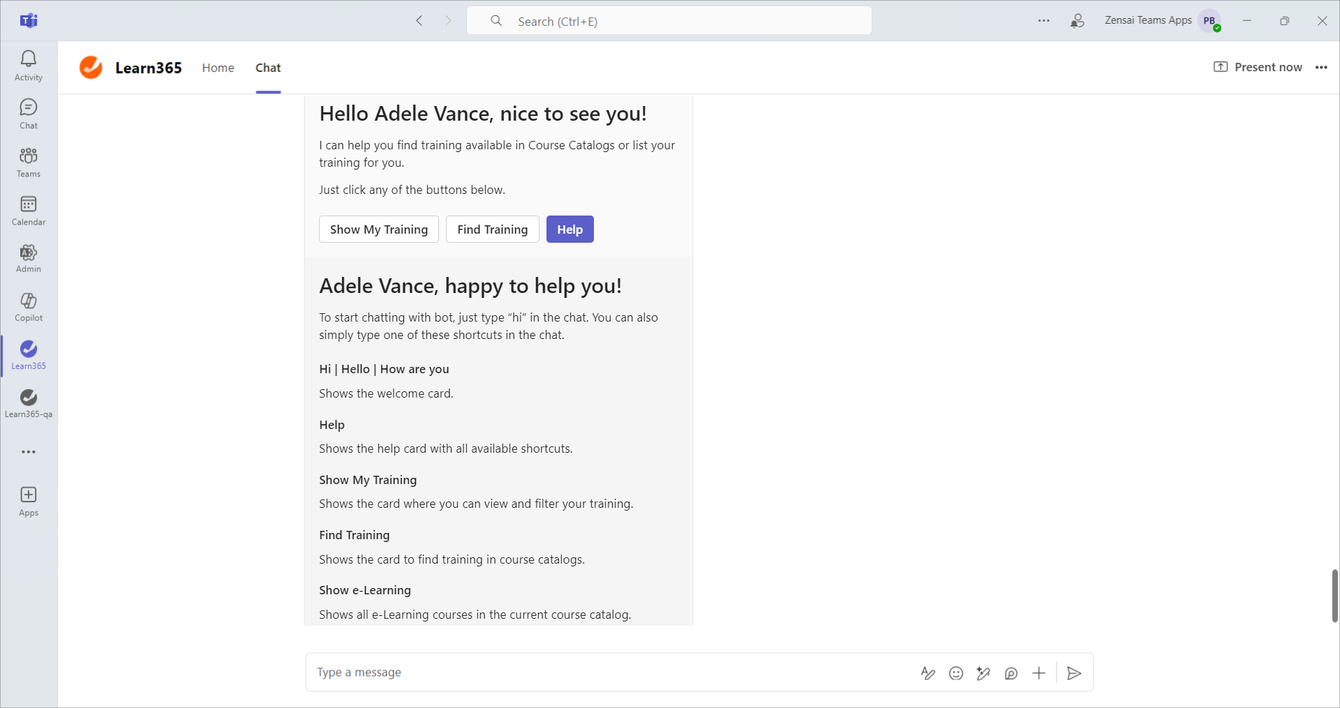 Zum Anzeigen einer Befehlsliste für den regulären Learn365-Chatbot auf der Registerkarte Chat geben Sie Hi oder Hello in das Nachrichtenfeld am unteren Rand der Registerkarte ein, woraufhin die Willkommenskarte angezeigt wird.