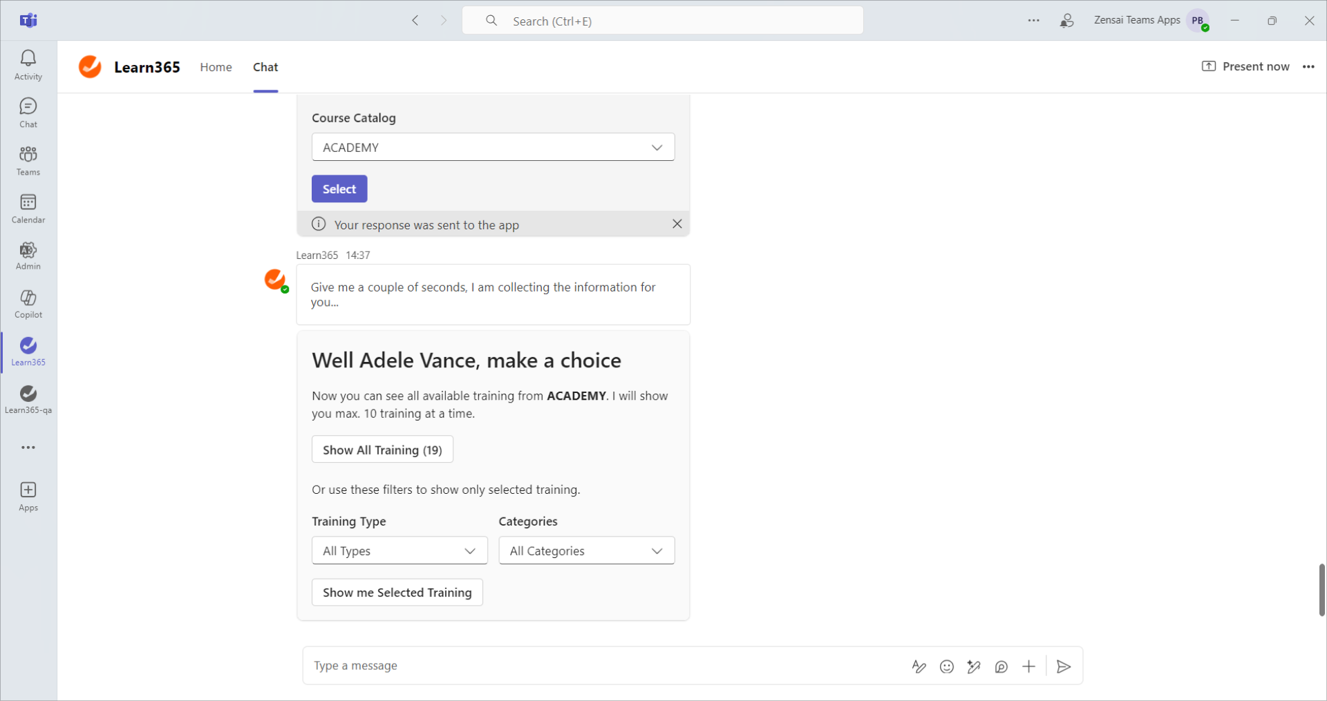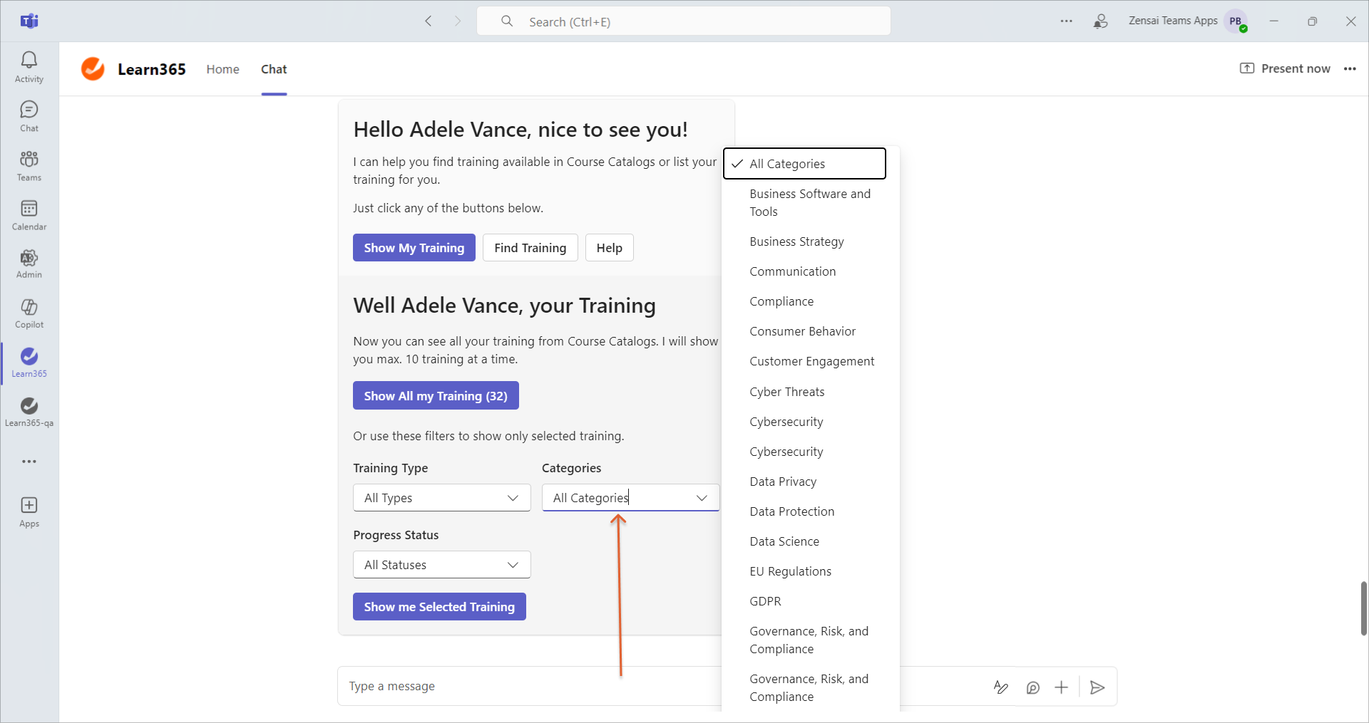 Nun steht Ihnen eine bestimmte Schulung, ein Katalog oder ein Dashboard als Chat in Teams zur Verfügung, und alle zugehörigen Optionen sind über ein Team in Microsoft Teams verfügbar.