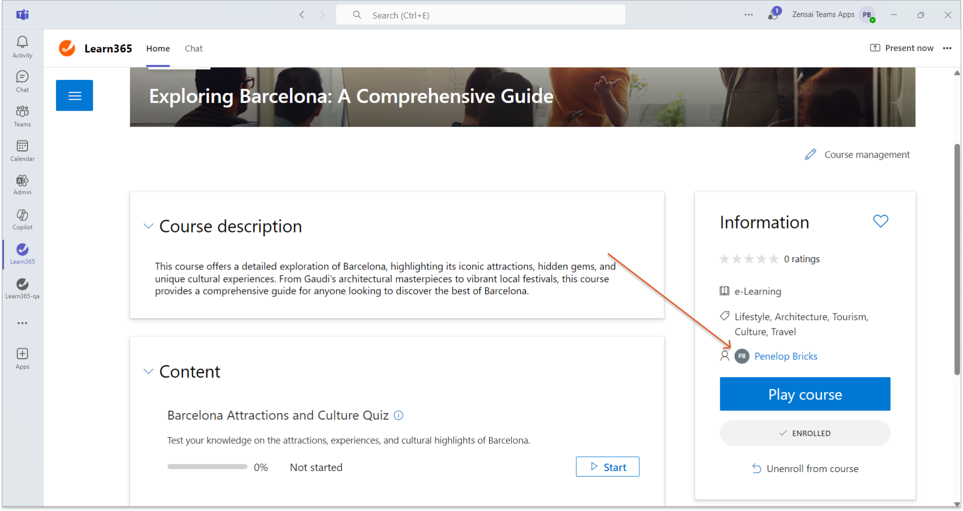 2. Wählen Sie im Bereich Informationen die Kontaktperson aus, an die Sie sich wenden möchten. Sie werden direkt in Microsoft Teams zu einem Chat mit der Kontaktperson weitergeleitet. Auf diese Weise können Benutzer ganz intuitiv im Kontext von Teams bleiben und so von einem verbesserten Lernerlebnis profitieren.