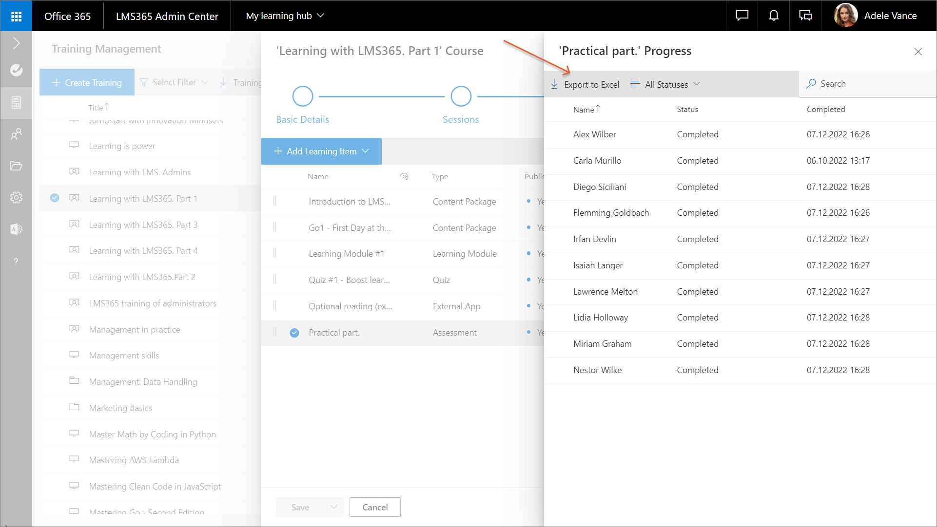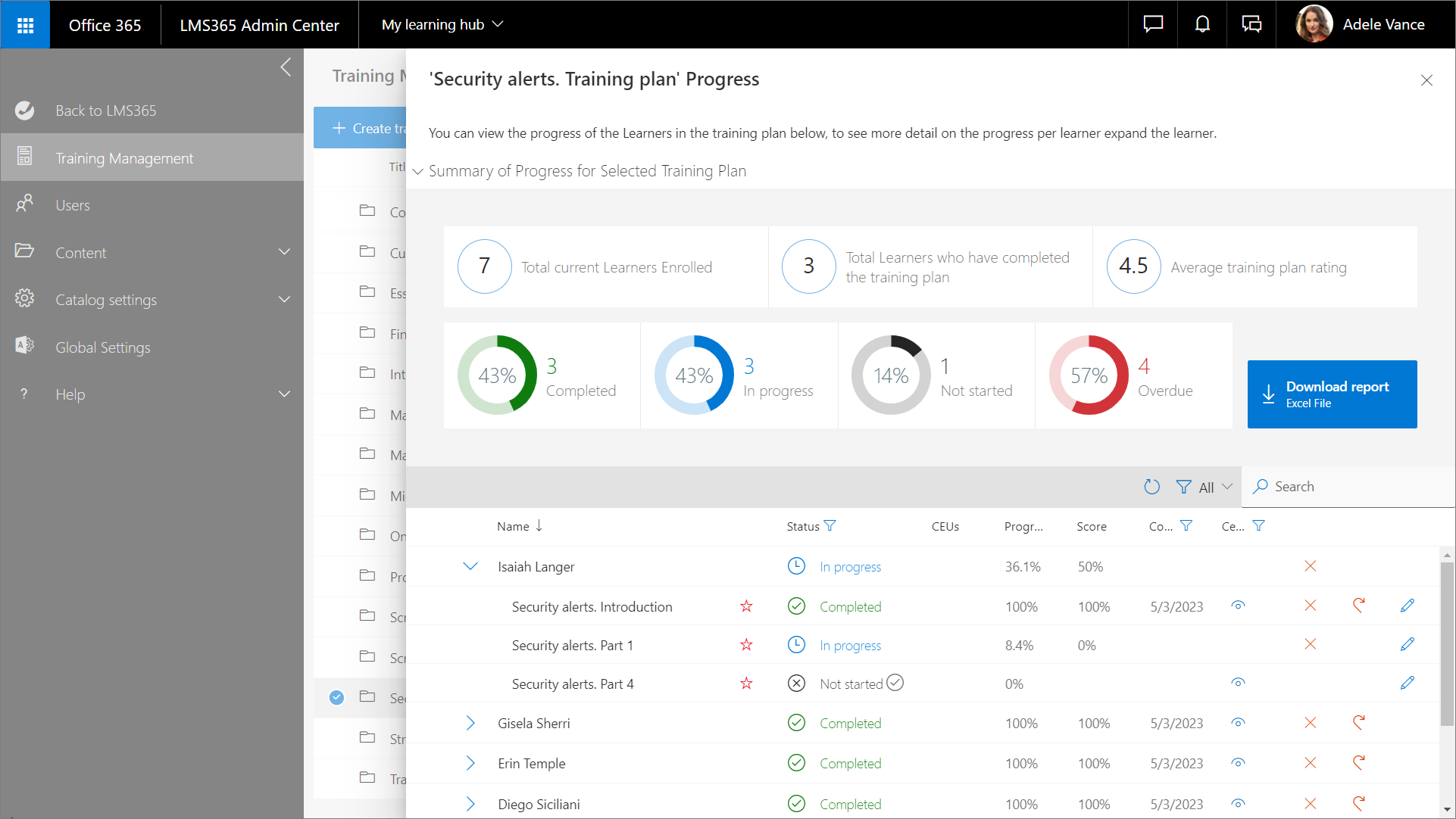 - Fortschritt des Lernenden einsehen. Hier finden Sie ausführliche Kennzahlen zum Schulungsfortschritt der Benutzer. Weitere Informationen finden Sie in diesem Artikel.