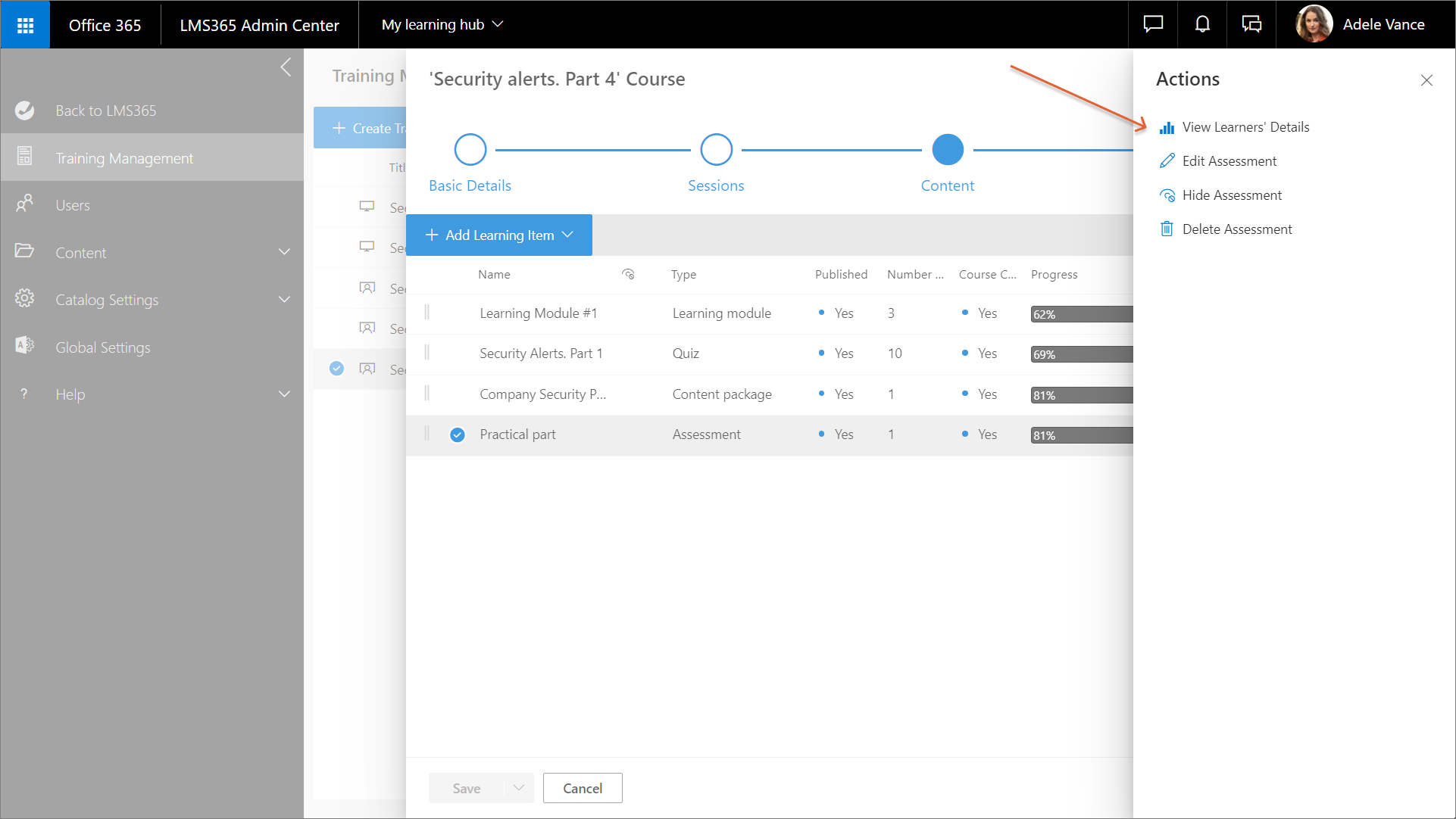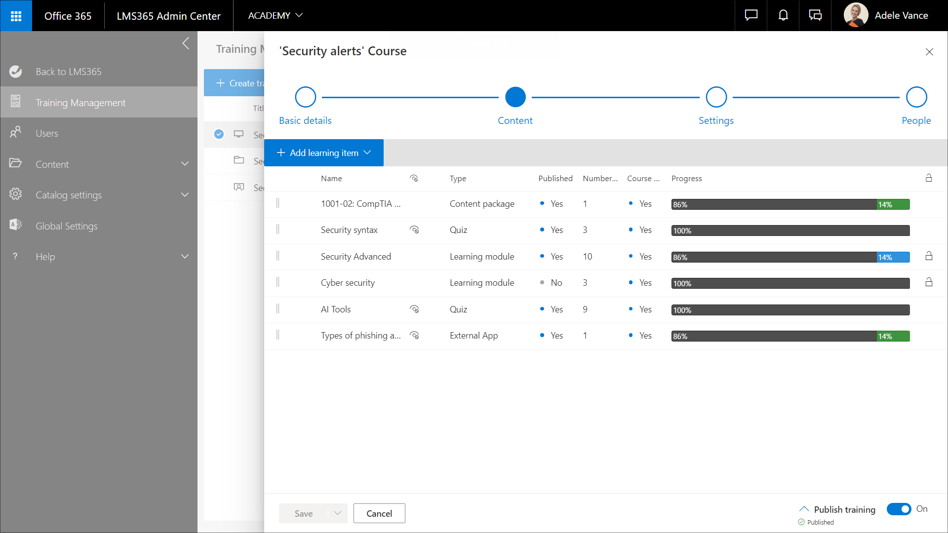 Gehen Sie zu Learn365 Admin Center > Schulungsverwaltung, wählen Sie den betreffenden Kurs aus und klicken Sie auf Kursinhalte verwalten.