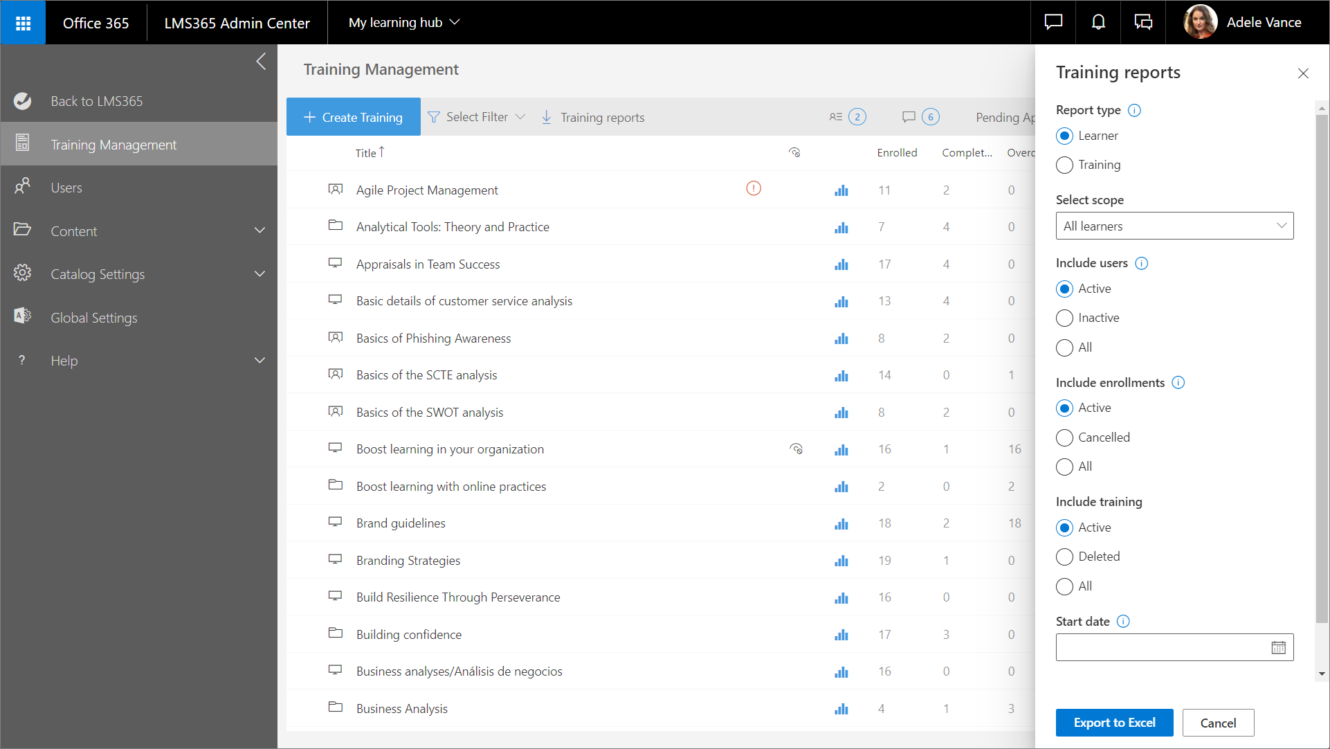 Über Learn365 Admin Center > Schulungsverwaltung > Schulungsberichte können Sie Berichte erstellen, die Metriken zu allen Benutzern in einem Katalog sowie zu ihrem individuellen, allgemeinen Fortschritt liefern.