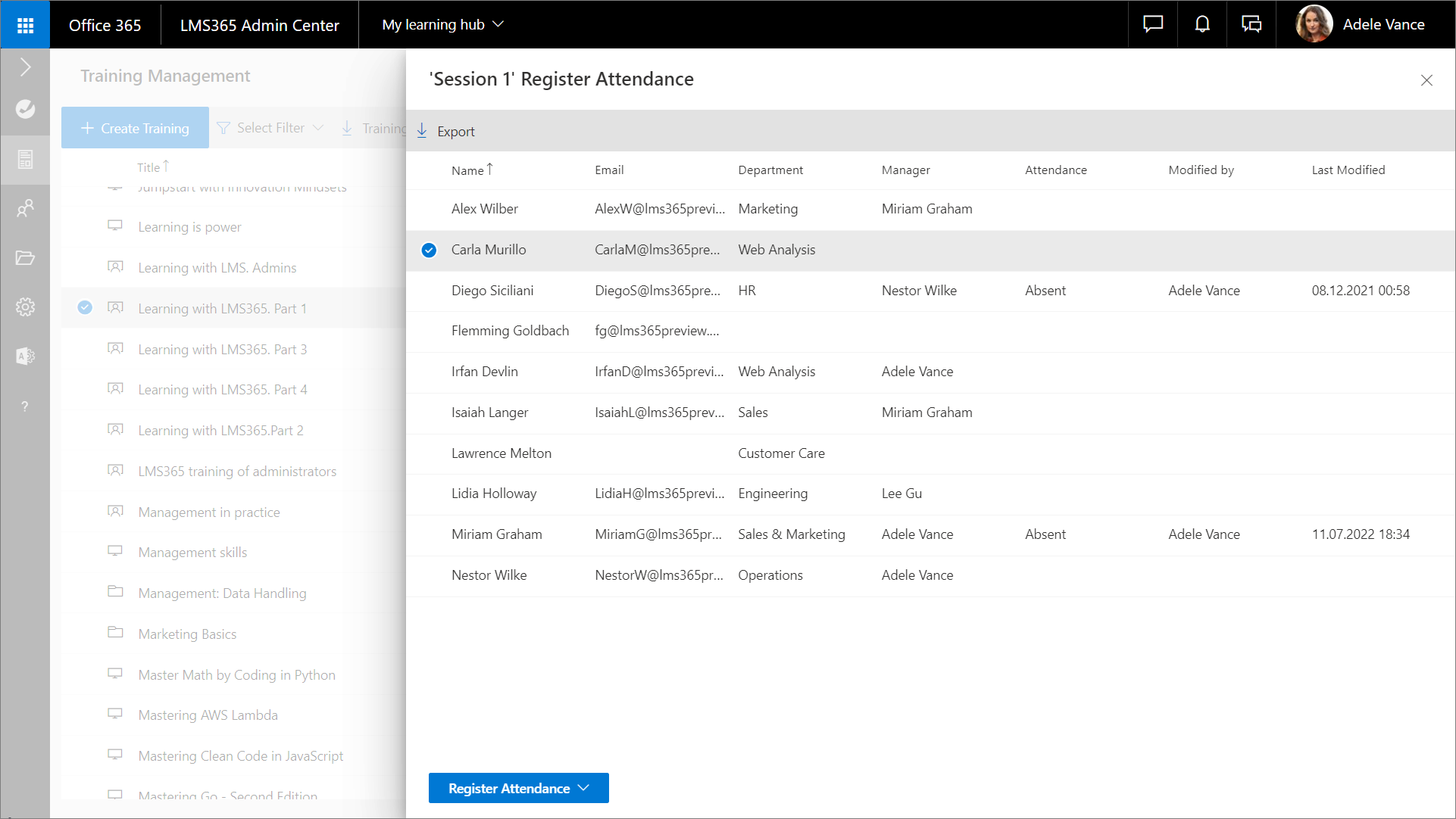 - Eine Möglichkeit, wie Sitzungsleiter und Kursadministratoren die Anwesenheit einzelner Lernender bei einer Sitzung (eigenständig oder in einer Gruppe) registrieren können, besteht darin, die Sitzung im Abschnitt Sitzungen des betreffenden Kurses auszuwählen und auf Anwesenheit registrieren zu klicken. In dieser Ansicht können Sie durch Klicken auf Exportieren die Anwesenheitsübersicht der Sitzung als Excel-Datei auf Ihr Gerät herunterladen.