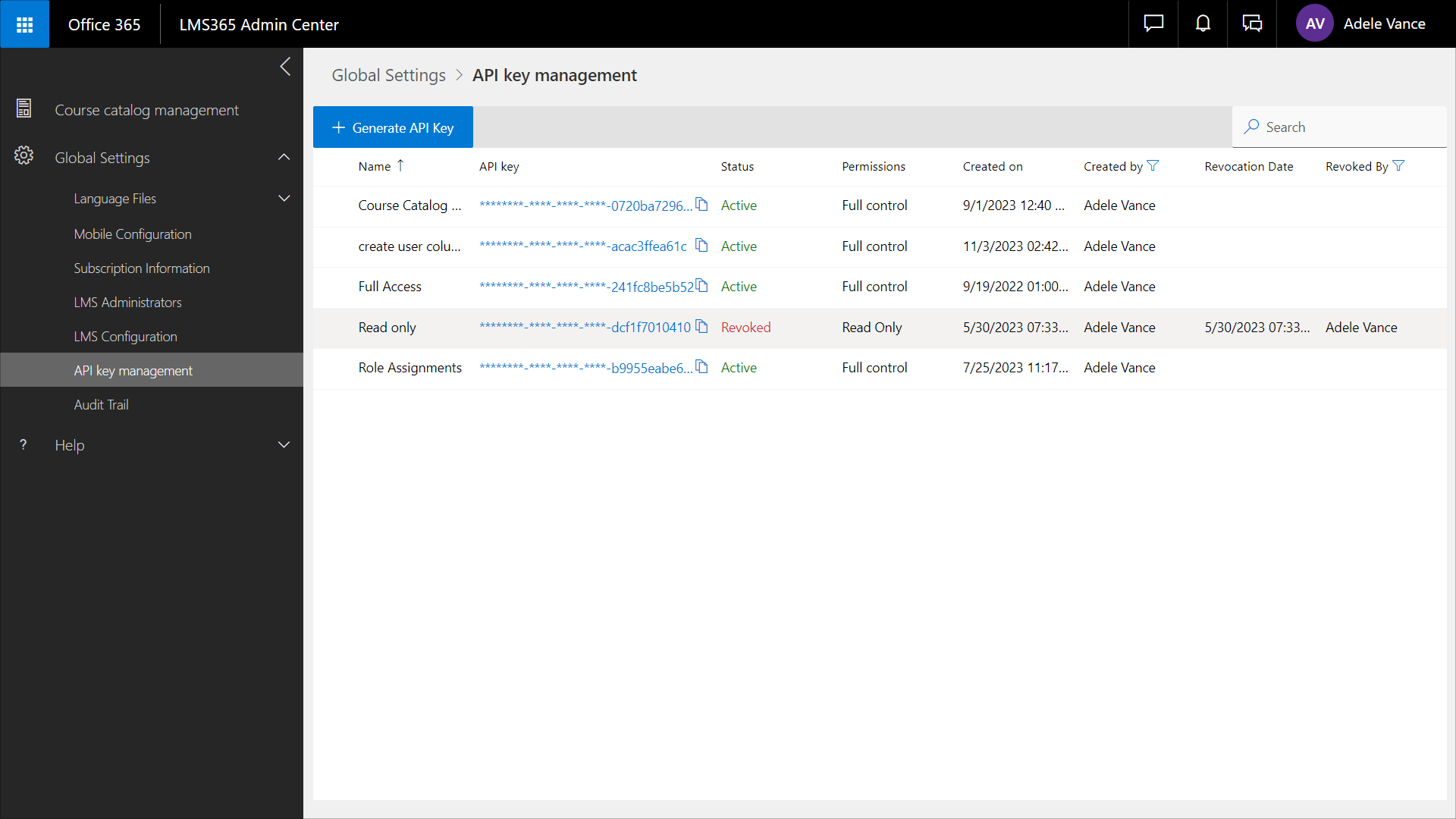 Auf der Seite API-Schlüsselverwaltung können Administratoren alle API-Schlüssel in der Learn365-Lösung anzeigen, neue API-Schlüssel generieren, Berechtigungen zuweisen und widerrufen sowie aktuelle API-Schlüssel bearbeiten.