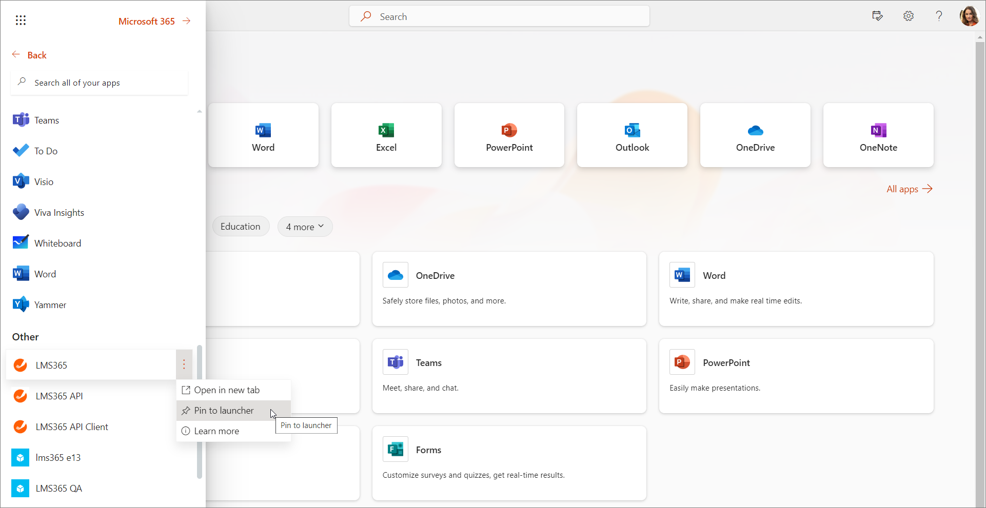 Zum schnelleren Navigieren können Sie die Learn365-App an das Microsoft 365-App-Startfeld anheften.