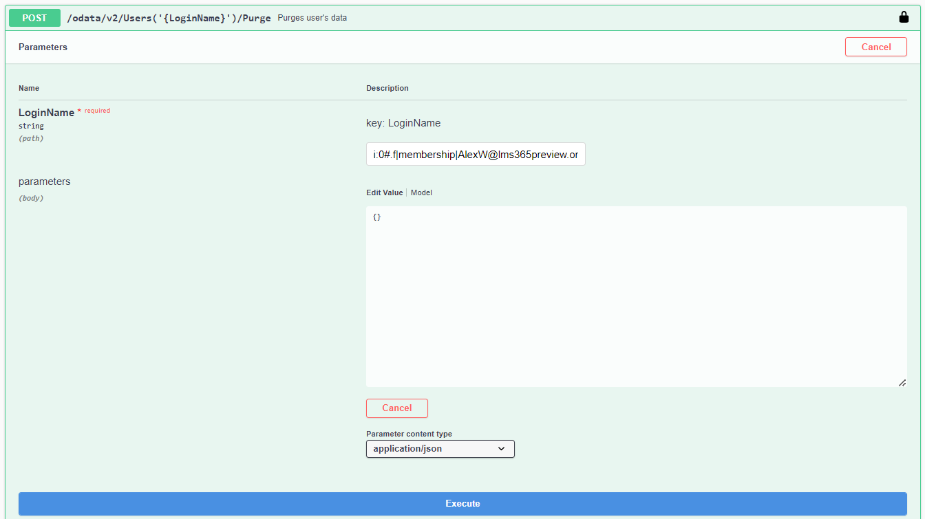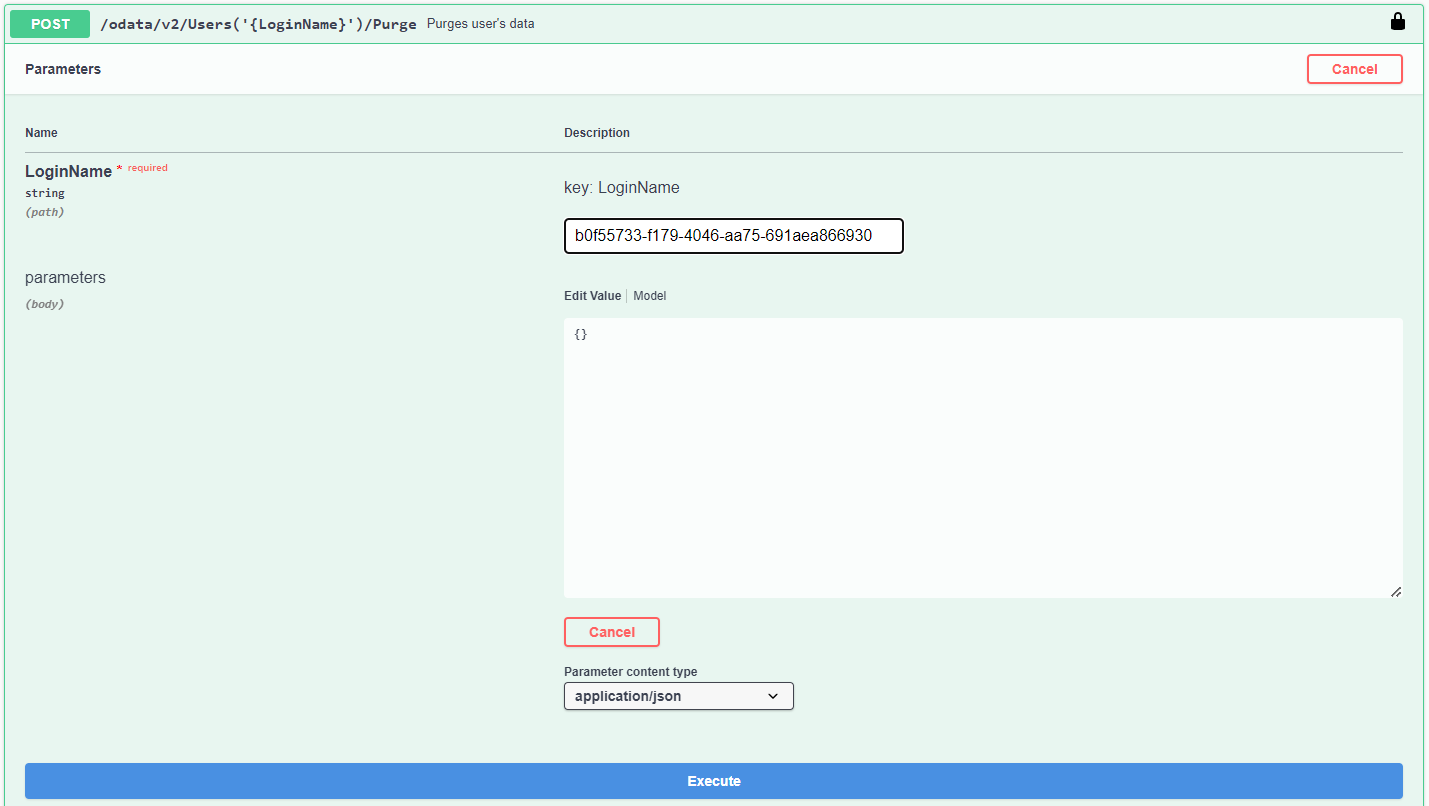 2. Suchen und erweitern Sie den Abschnitt Users, suchen Sie die Methode POST /odata/v2/Users('{LoginName}')/Purge mit der Beschreibung Purges user's data und wählen Sie oben rechts Try it out aus.