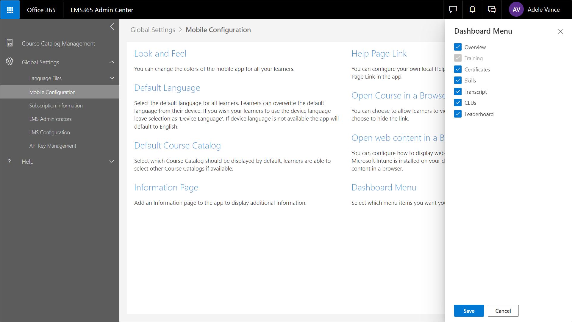 LMS-Administratoren können konfigurieren, welche Abschnitte auf der Registerkarte Dashboard in der Learn365-Mobil-App angezeigt werden. Zu diesem Zweck gehen Sie zu Learn365 Admin Center > Globale Einstellungen > Mobile Konfiguration und klicken auf Dashboard-Menü.