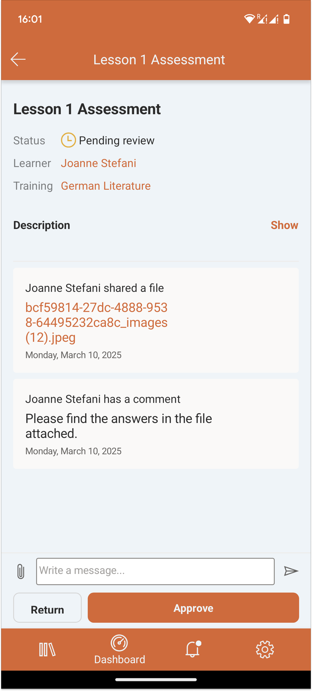 - Nachrichtenfeld. Hier kann der Betreuer Kommentare senden oder Dateien für Bewertungen mit den Status Nicht gestartet oder Prüfung ausstehend hochladen. Der Lernende kann Kommentare und Dateien von Betreuern einsehen, wenn er die Bewertung öffnet. Eine Datei darf maximal 50 MB groß sein.