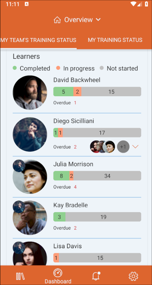Wählen Sie einen Benutzer aus, um seinen Fortschritt sowie von ihm abgeschlossene, laufende, noch nicht begonnene und überfällige Schulungen anzuzeigen. Zum Schließen der Benutzerfortschrittsansicht tippen Sie einfach außerhalb davon.