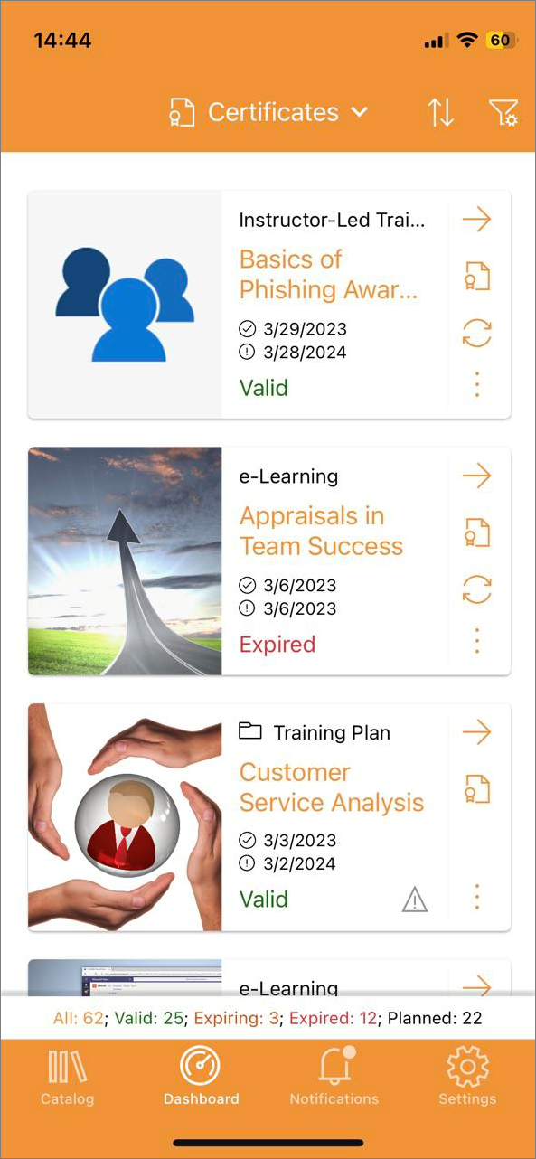 Wenn ein Benutzer einen Kurs oder Schulungsplan wiederholt, werden ihm doppelte Zertifikate mit jeweils unterschiedlichem Status angezeigt. Dabei hat ein Zertifikat den Status Gültig/Abgelaufen/Ablaufend, das andere den Status Geplant. Ein Dreieck mit einem Ausrufezeichen darin wird auf der Schulungskarte für das Zertifikat mit dem Status Gültig/Abgelaufen/Ablaufend angezeigt, um zu signalisieren, dass der Kurs oder Schulungsplan wiederholt wird.