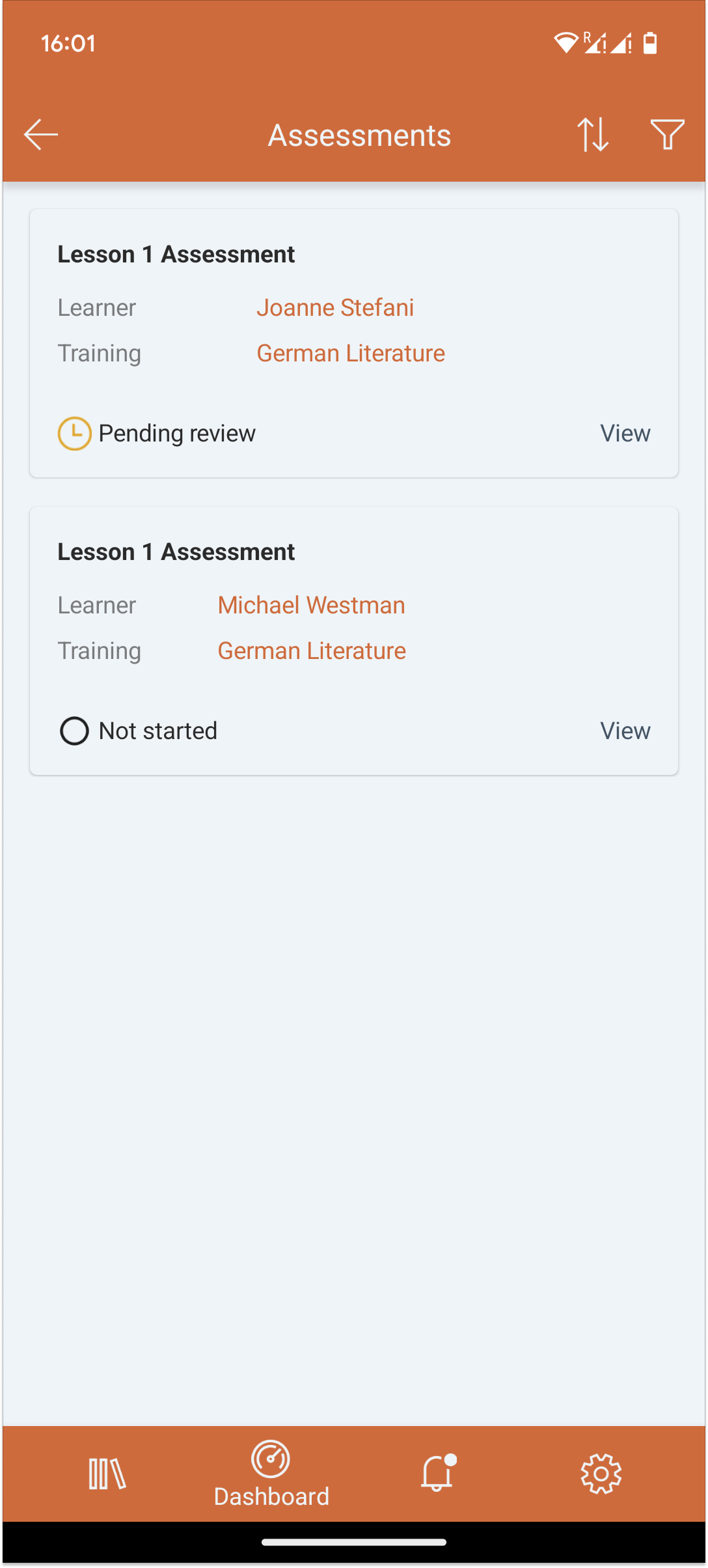 - Sortieren nach dem Namen des Lernenden, dem Kurstitel oder dem Titel der Bewertung (alphabetisch auf- oder absteigend). Zum Sortieren tippen Sie auf das Pfeilsymbol oben rechts auf dem Display.