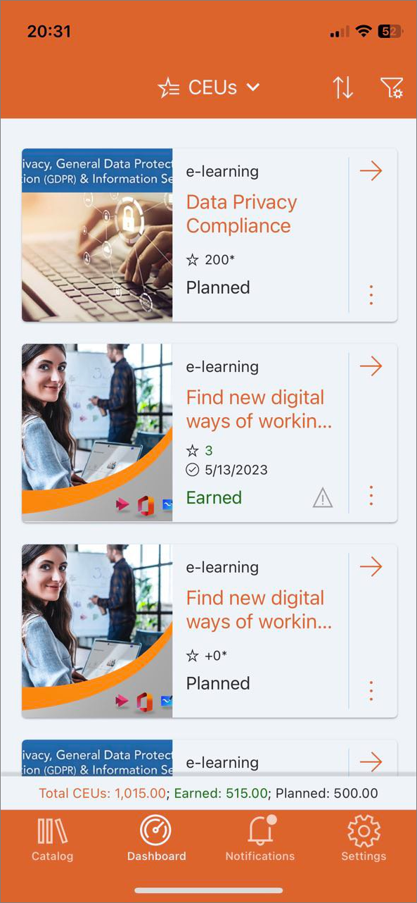 Wenn Benutzer sich in der Learn365-Mobil-App anmelden, werden sie automatisch zum Abschnitt Schulung der Registerkarte Dashboard weitergeleitet.