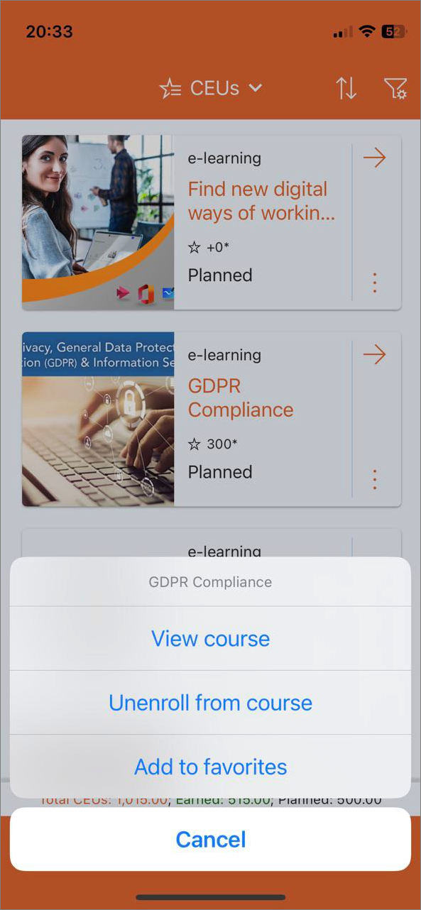 Wenn eine Schulung für den Benutzer nicht mehr verfügbar ist (weil die Schulung storniert, gelöscht oder importiert wurde oder die Veröffentlichung zurückgezogen wurde), wird der Titel der Schulung abgeblendet und ist nicht mehr anklickbar. Der Benutzer kann dann nicht mehr durch Tippen auf das Zertifikat auf die Schulung zugreifen.