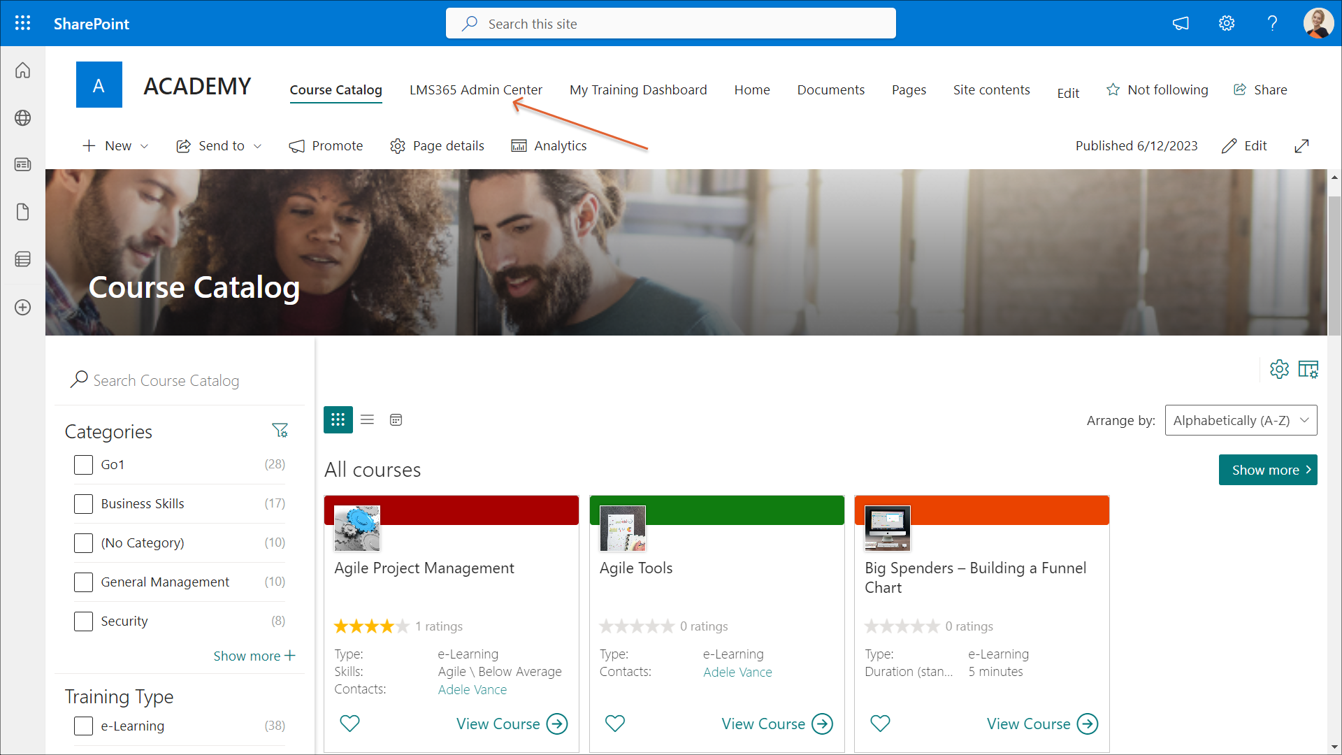 In diesem Artikel beschreiben wir, wie Sie einen Link hinzufügen, der es Administratoren ermöglicht, über die Websitenavigation auf der SharePoint-Website eines Kurskatalogs zum Learn365 Admin Center zu navigieren.