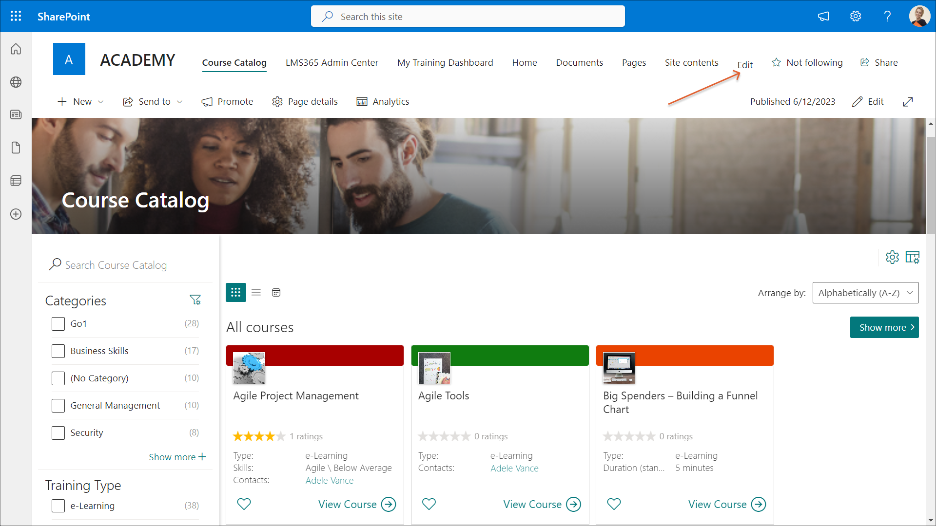 1. Gehen Sie zur Startseite des Kurskatalogs und klicken Sie in der Websitenavigation auf Bearbeiten.