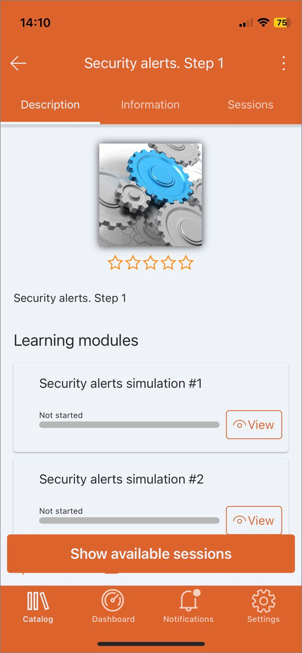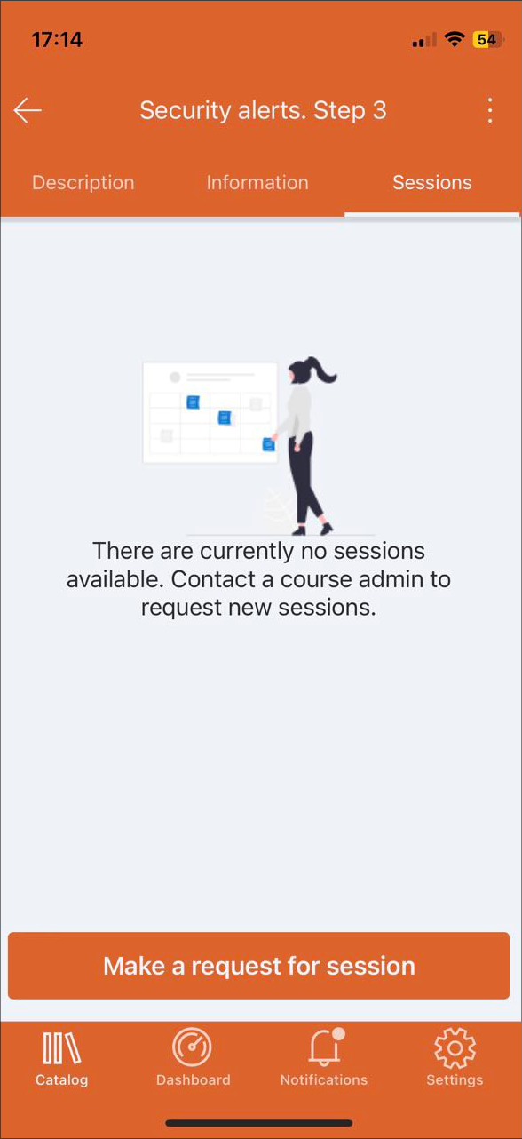 Durch Tippen auf Verfügbare Sitzungen anzeigen werden Benutzer zur Registerkarte Sitzungen weitergeleitet, wo eine Liste von eigenständigen Sitzungen und Sitzungsgruppen des Kurses mit ausführlichen Informationen angezeigt wird. Verfügbare Sitzungen anzeigen wird automatisch durch Für Kurs registrieren ersetzt, wenn eine eigenständige Sitzung oder eine Sitzungsgruppe ausgewählt wird.