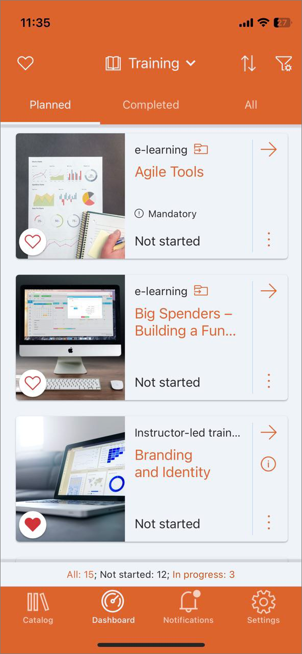 Wenn ein Benutzer sich in der Learn365-Mobil-App angemeldet hat, wird er automatisch zum Abschnitt Schulungen auf der Registerkarte Dashboard weitergeleitet. Hier werden Kurse und Schulungspläne mit dem Fortschrittsstatus Geplant angezeigt.