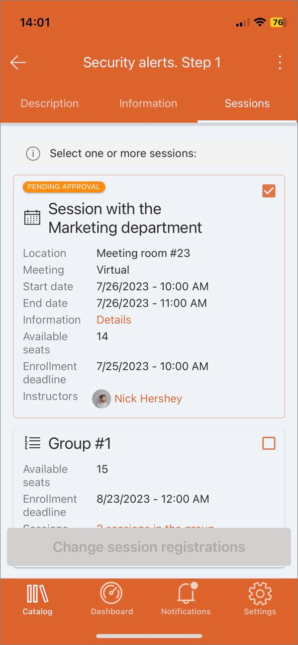 Die Option Sitzungsregistrierungen ändern ermöglicht es Lernenden, eigenständige Sitzungen und Sitzungsgruppen zu ändern, für die sie sich registriert haben (d. h., die Registrierung hat den Status Registriert), bei denen sie Auf der Warteliste stehen oder für die die Genehmigung ausstehend ist.