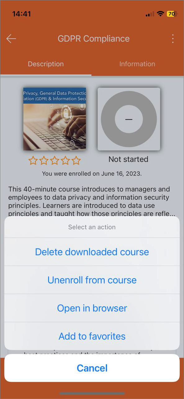 Durch Tippen auf den Schulungstitel oder das Pfeilsymbol auf einer Schulungskarte werden Benutzer zum entsprechenden Kurs oder Schulungsplan weitergeleitet, wo eine Anzahl von Aktionen zur Verfügung steht.
