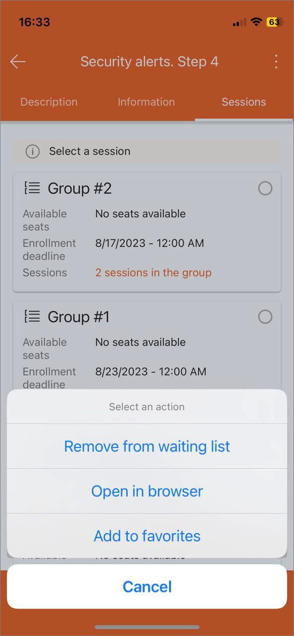 Wenn in keiner der ausgewählten eigenständigen Sitzungen oder Sitzungsgruppen Plätze verfügbar sind, wird die Option Für Kurs registrieren auf Zur Warteliste hinzufügen umgestellt. In diesem Fall fügt die Auswahl von Zur Warteliste hinzufügen den Benutzer zur Warteliste für die ausgewählten eigenständigen Sitzungen und Sitzungsgruppen hinzu. Der Status Auf Warteliste wird auf den Karten der entsprechenden Sitzungen angezeigt.