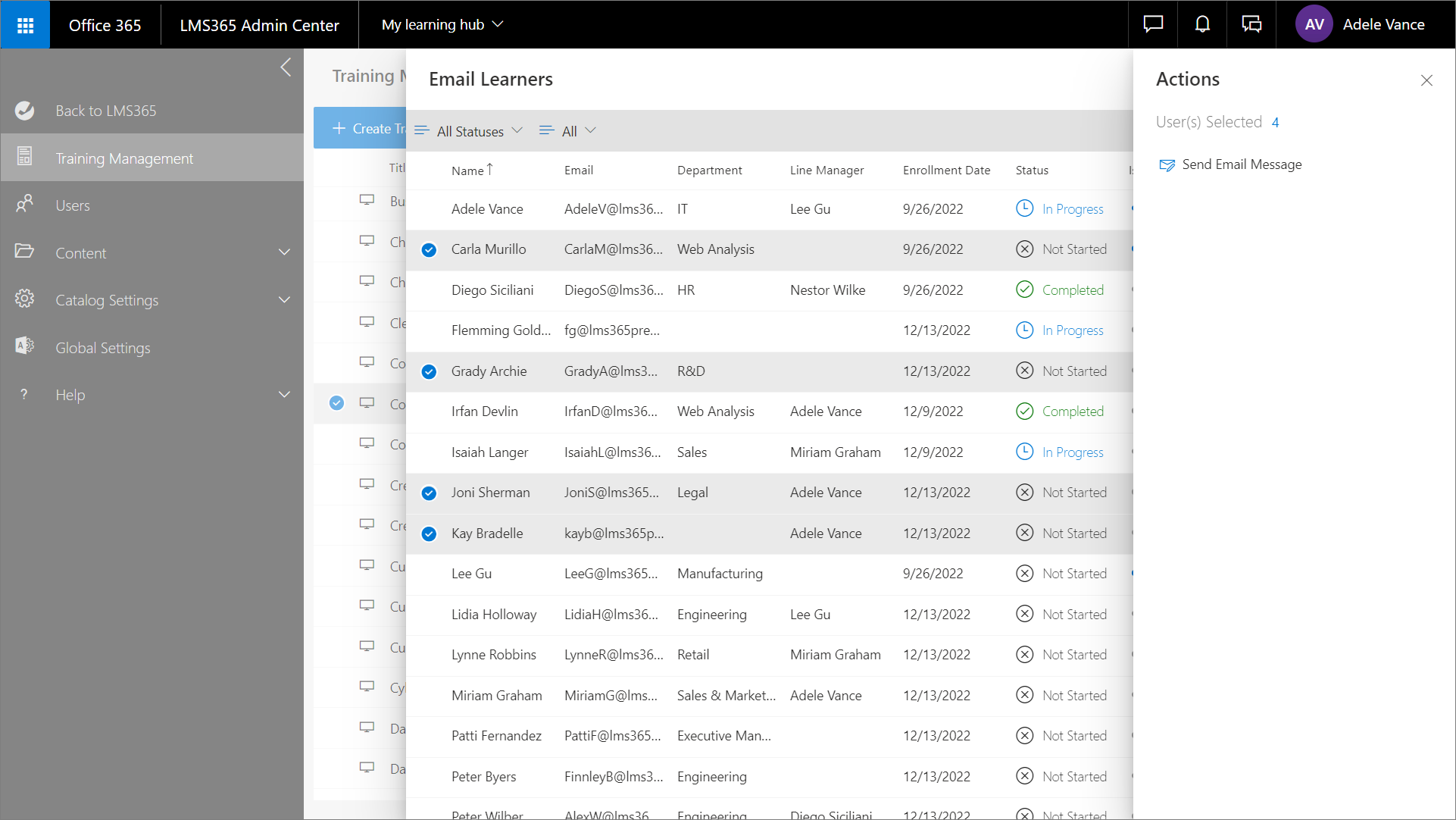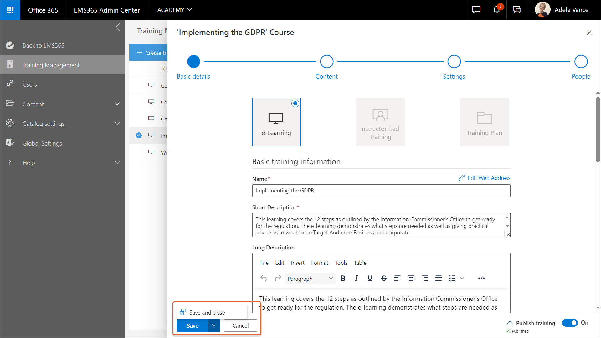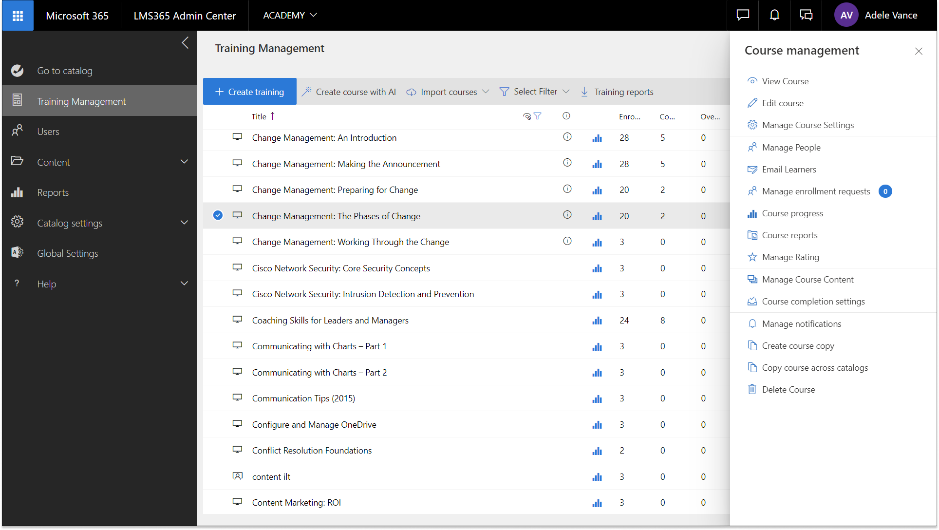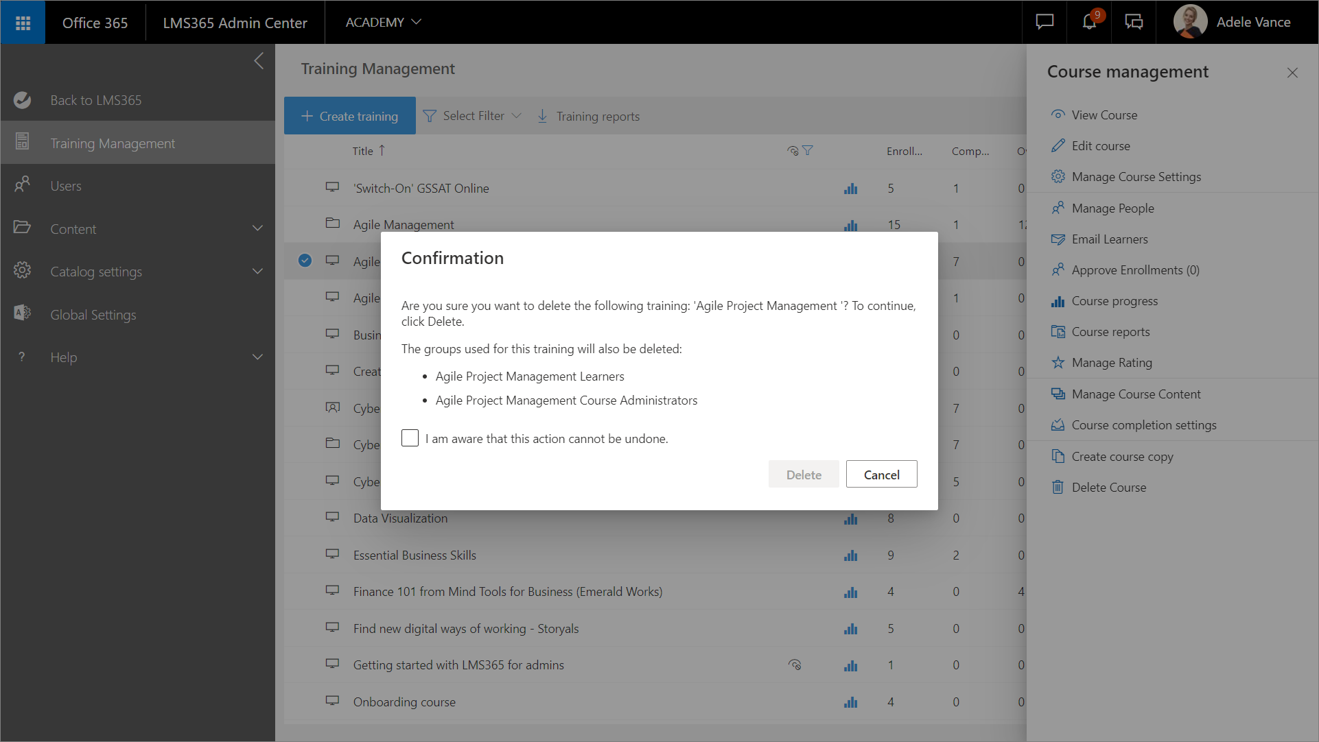 - Klicken Sie auf Learn365 Admin Center > Schulungsverwaltung und wählen Sie den gewünschten Kurs aus. Der Bereich Kursverwaltung öffnet sich auf der rechten Seite im Learn365 Admin Center.