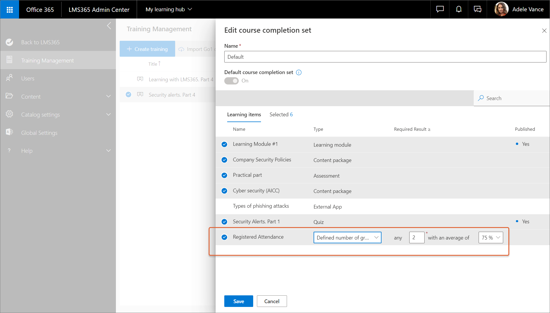 - Die konfigurierte Mindestteilnahmequote mit den Werten 25 %, 50 %, 75 % und 100 % wird in das Standard-Kursabschluss-Set aufgenommen und muss erfüllt werden, um den Kurs abzuschließen.