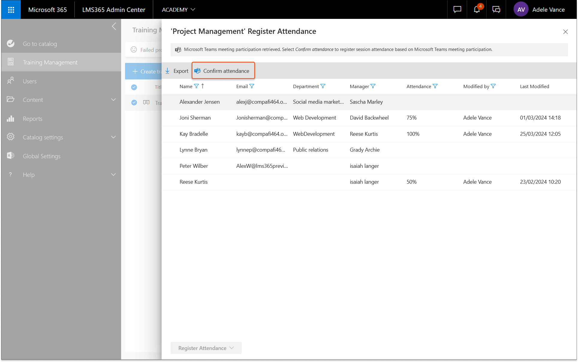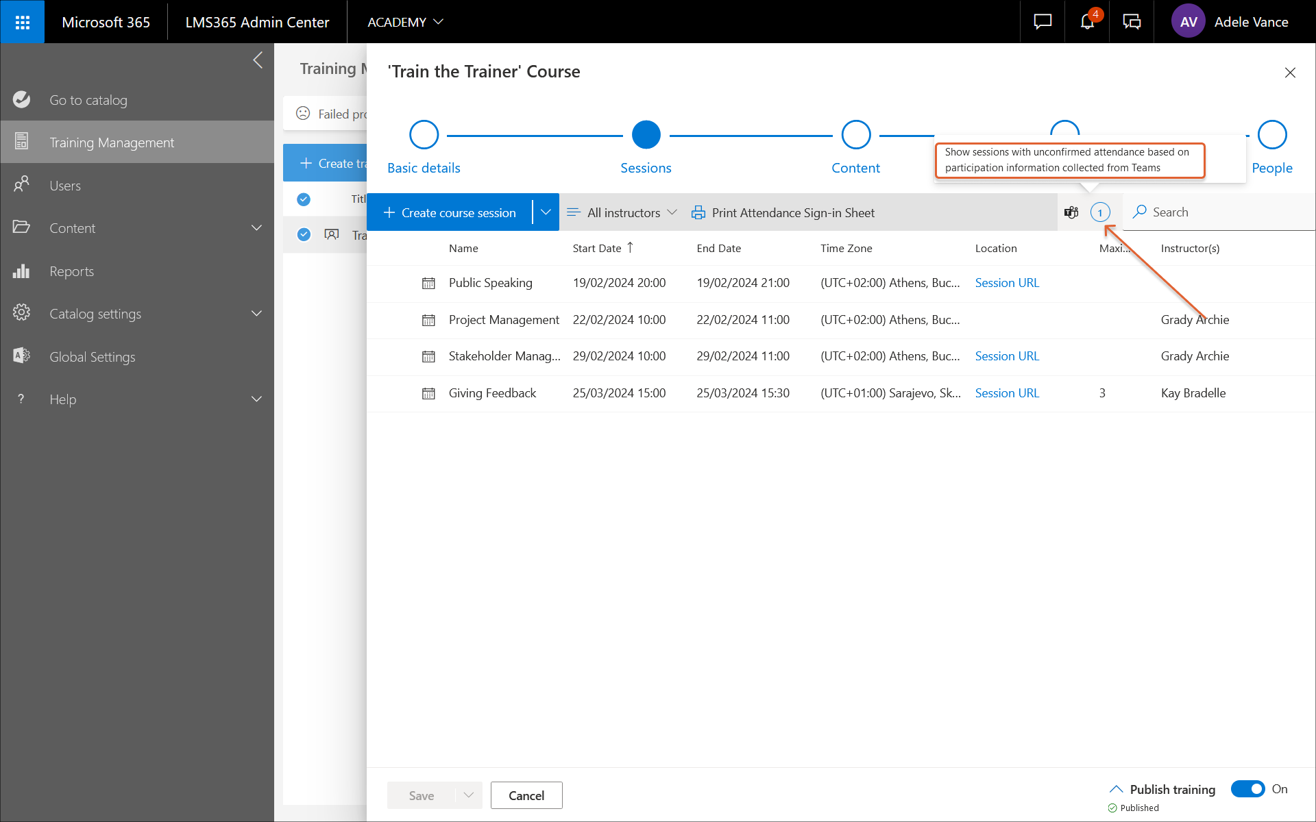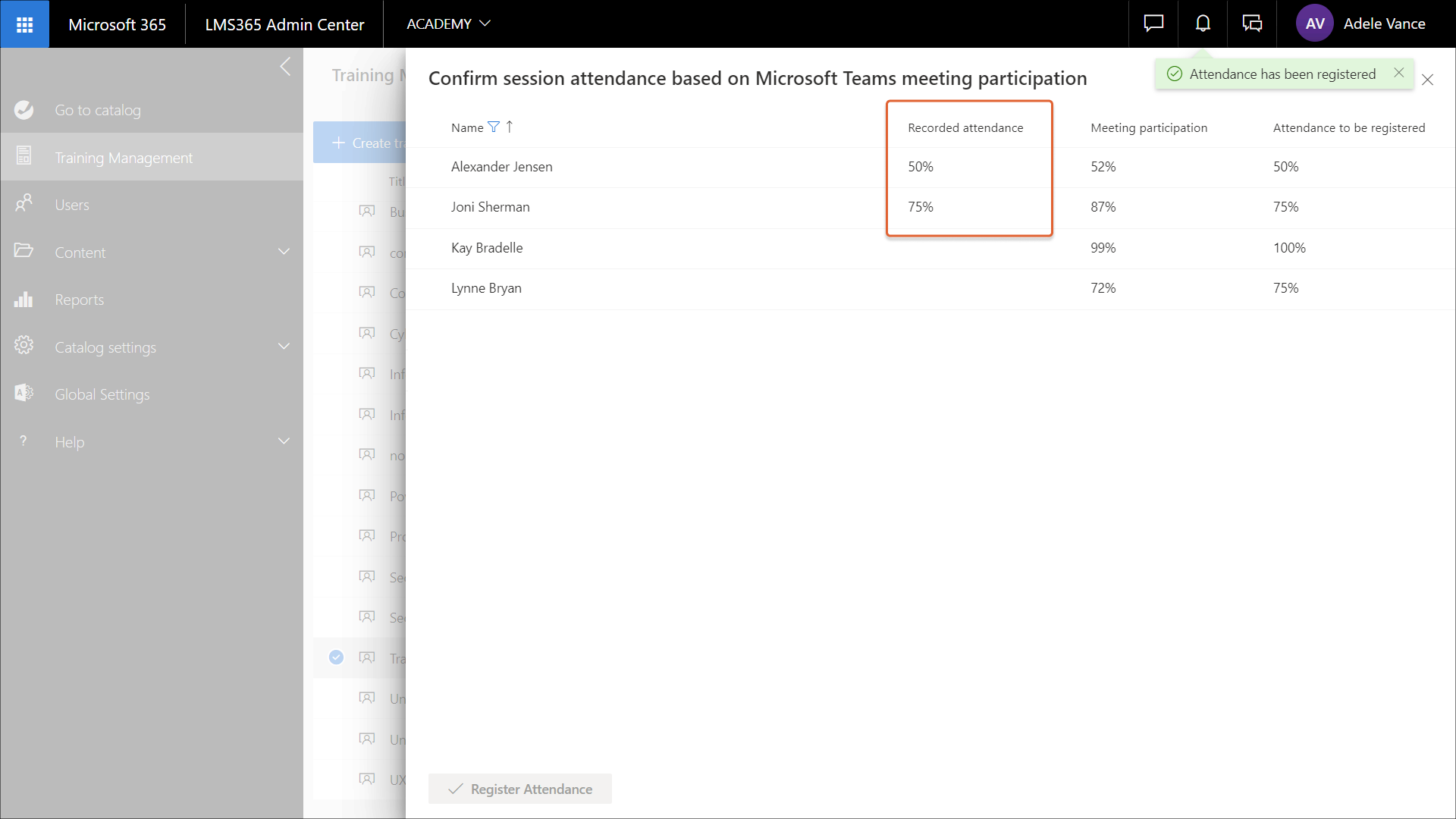Wenn eine Microsoft Teams-Schulungssitzung innerhalb von Learn365 erstellt wird, wird die Teilnahme automatisch kurz nach dem Ende der Sitzung aus Teams abgerufen. Kursadministratoren können festlegen, dass die Anwesenheit automatisch auf Grundlage von Berichten zur Anwesenheit bei Teams-Besprechungen registriert wird. Zudem können sowohl Kursadministratoren als auch Sitzungsleiter die Anwesenheit von Lernenden manuell bestätigen, sobald der Bericht erstellt ist.