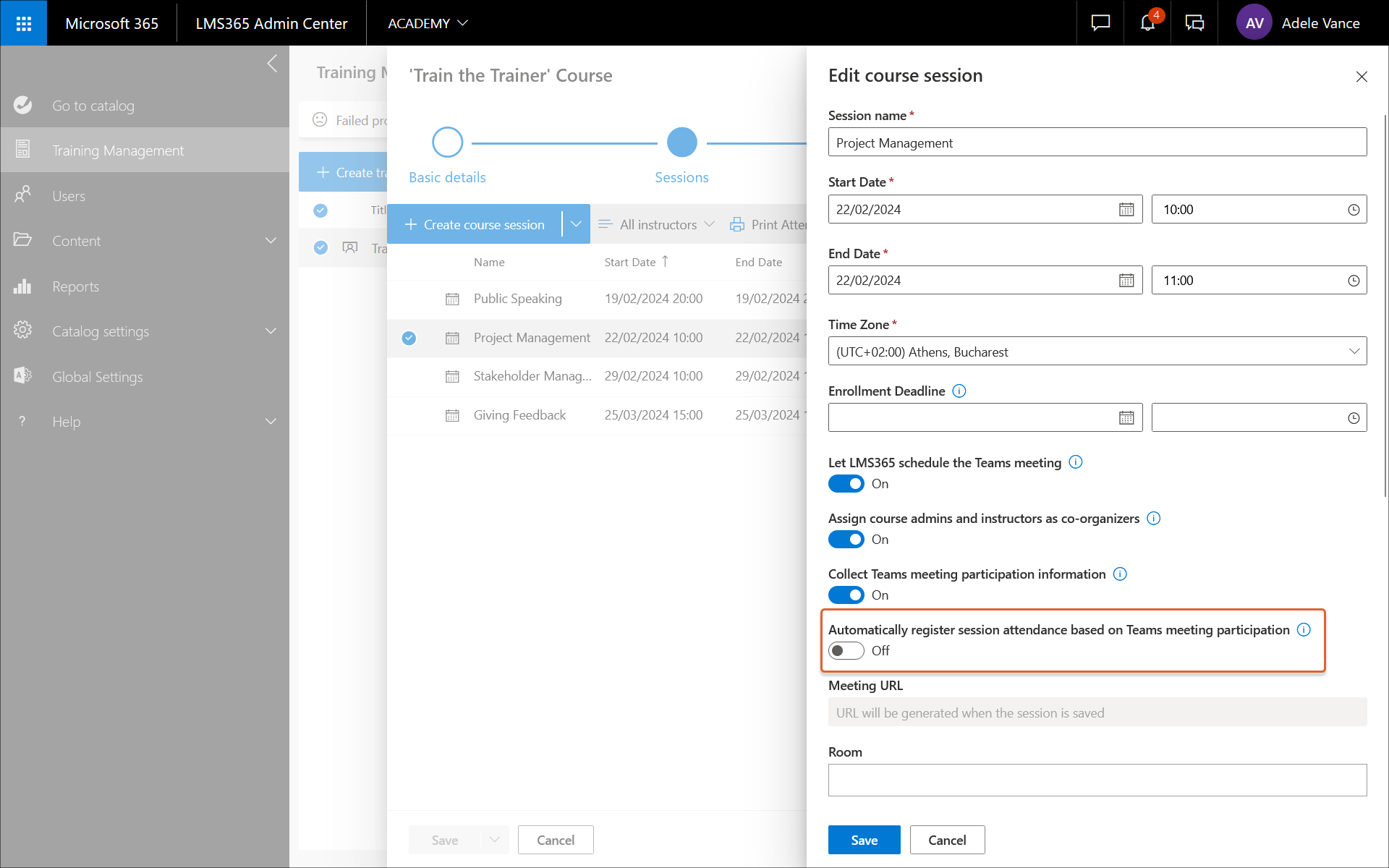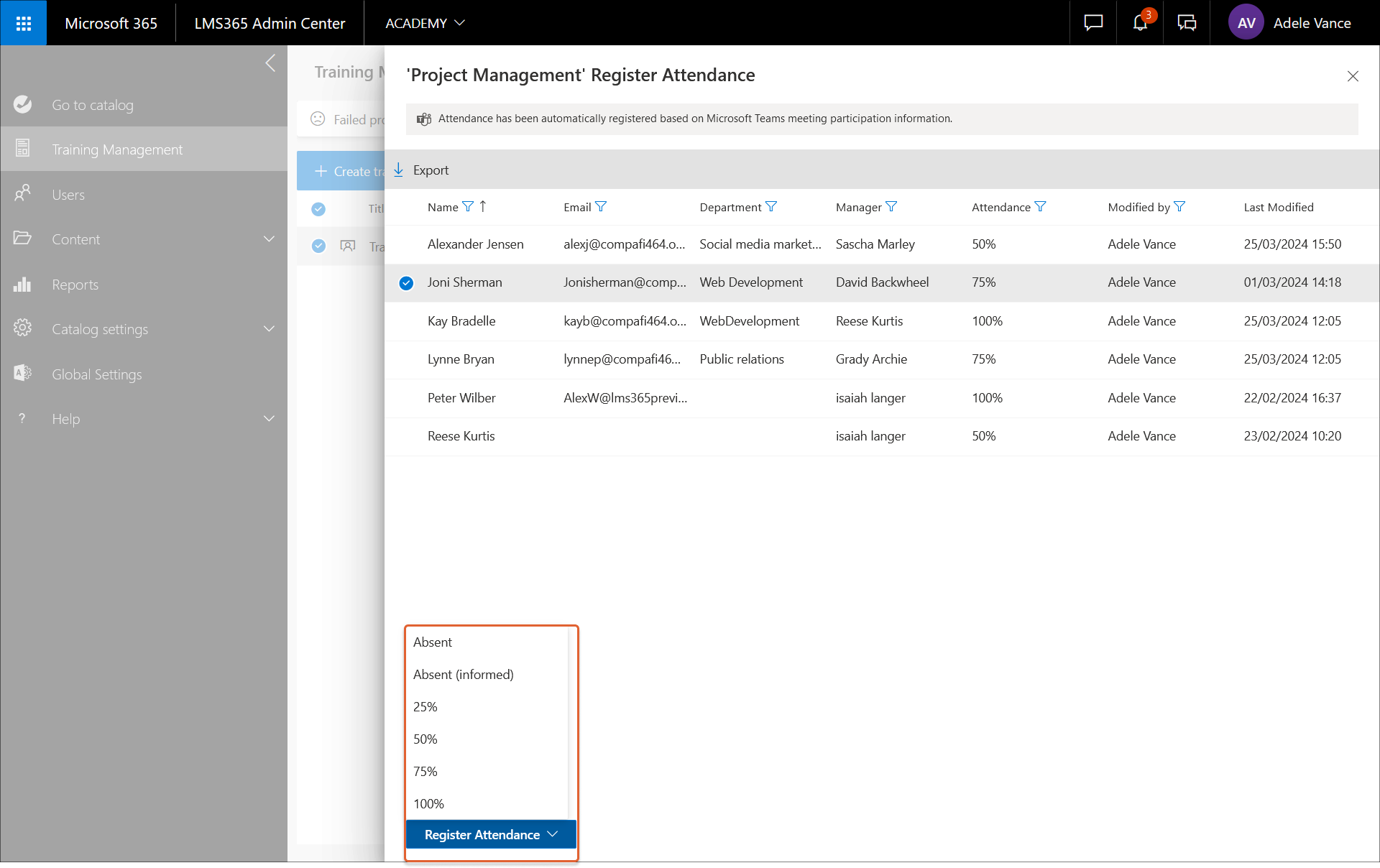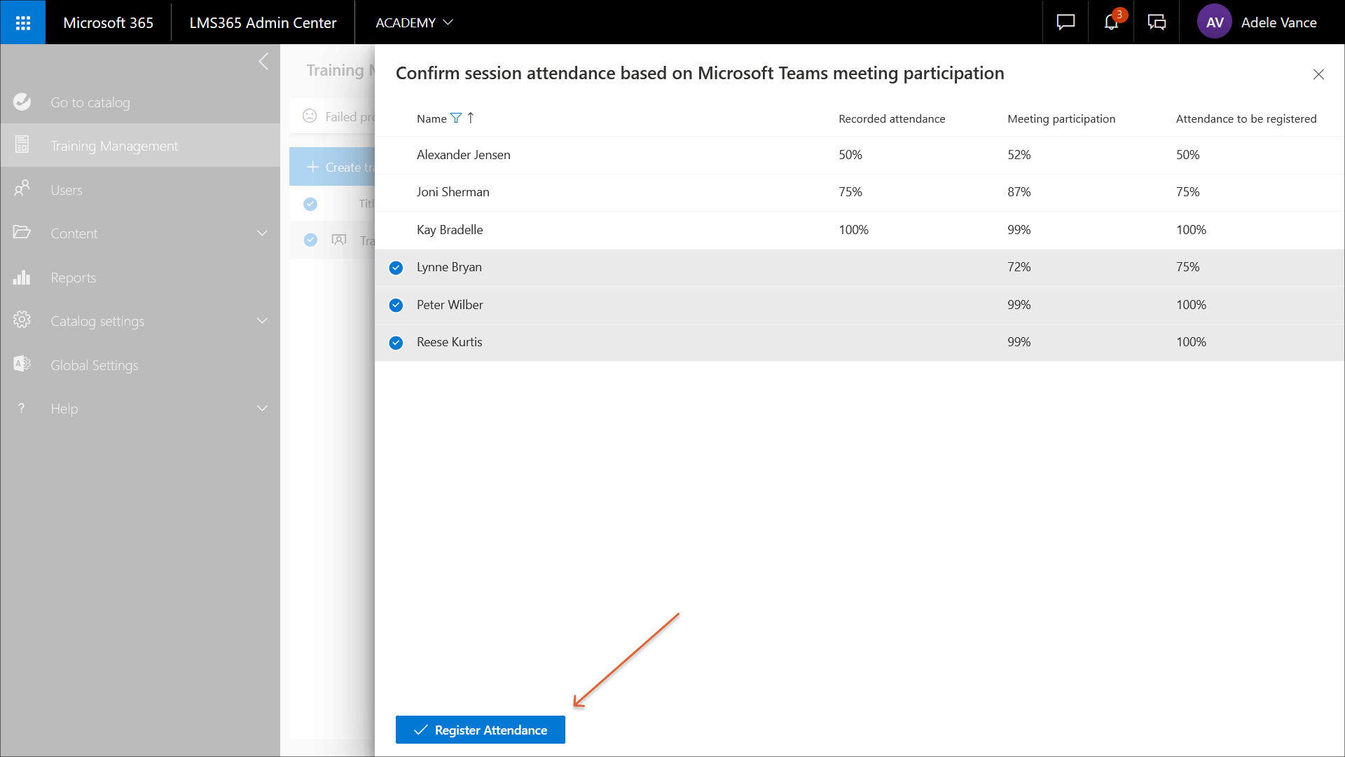 Wenn eine Microsoft Teams-Schulungssitzung innerhalb von Learn365 erstellt wird, wird die Teilnahme automatisch kurz nach dem Ende der Sitzung aus Teams abgerufen. Kursadministratoren können festlegen, dass die Anwesenheit automatisch auf Grundlage von Berichten zur Anwesenheit bei Teams-Besprechungen registriert wird. Zudem können sowohl Kursadministratoren als auch Sitzungsleiter die Anwesenheit von Lernenden manuell bestätigen, sobald der Bericht erstellt ist.