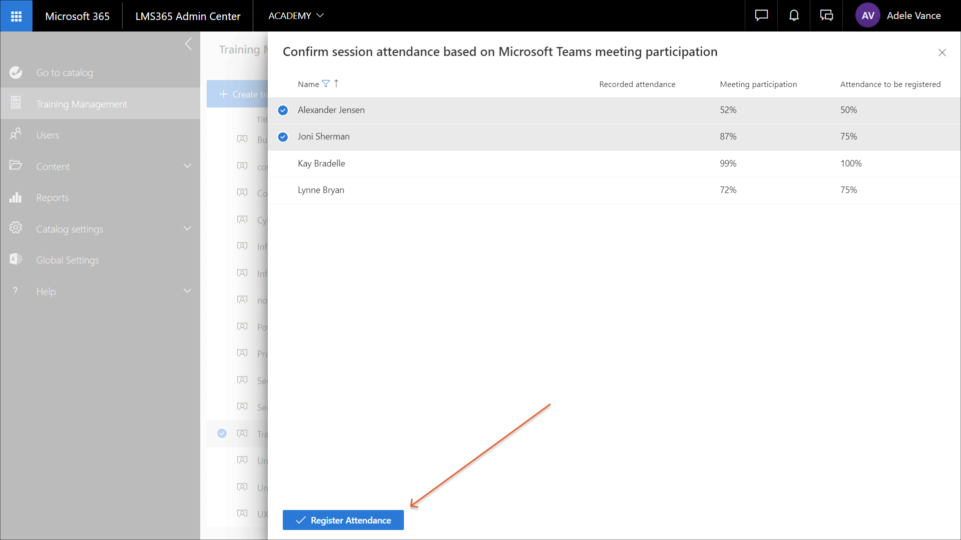 6. Im sich öffnenden Bereich Anwesenheit anhand der Meeting-Teilnahme in Microsoft Teams bestätigen wählen Sie die Lernenden aus, deren Anwesenheit Sie bestätigen möchten, und klicken dann auf Anwesenheit registrieren.