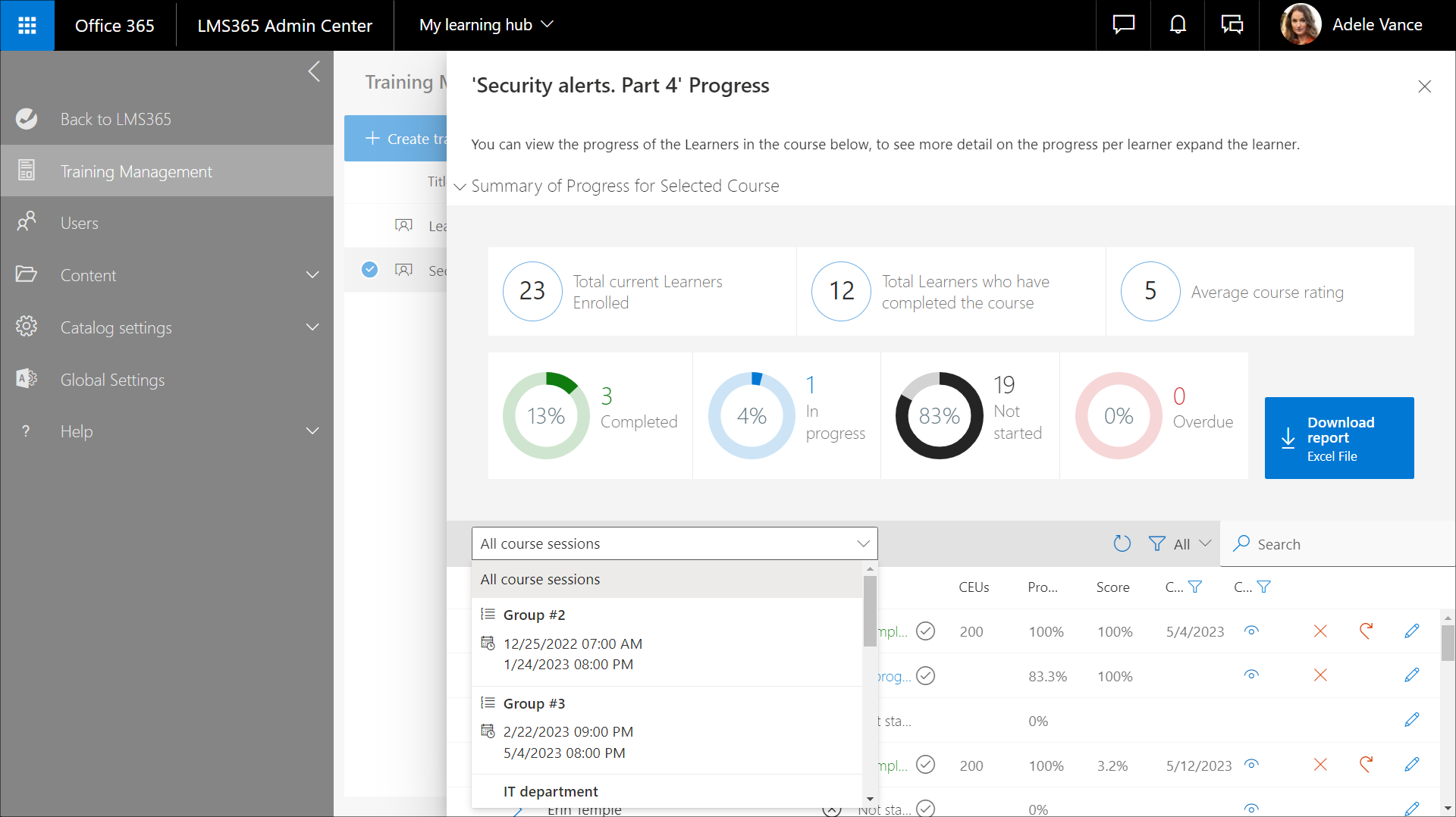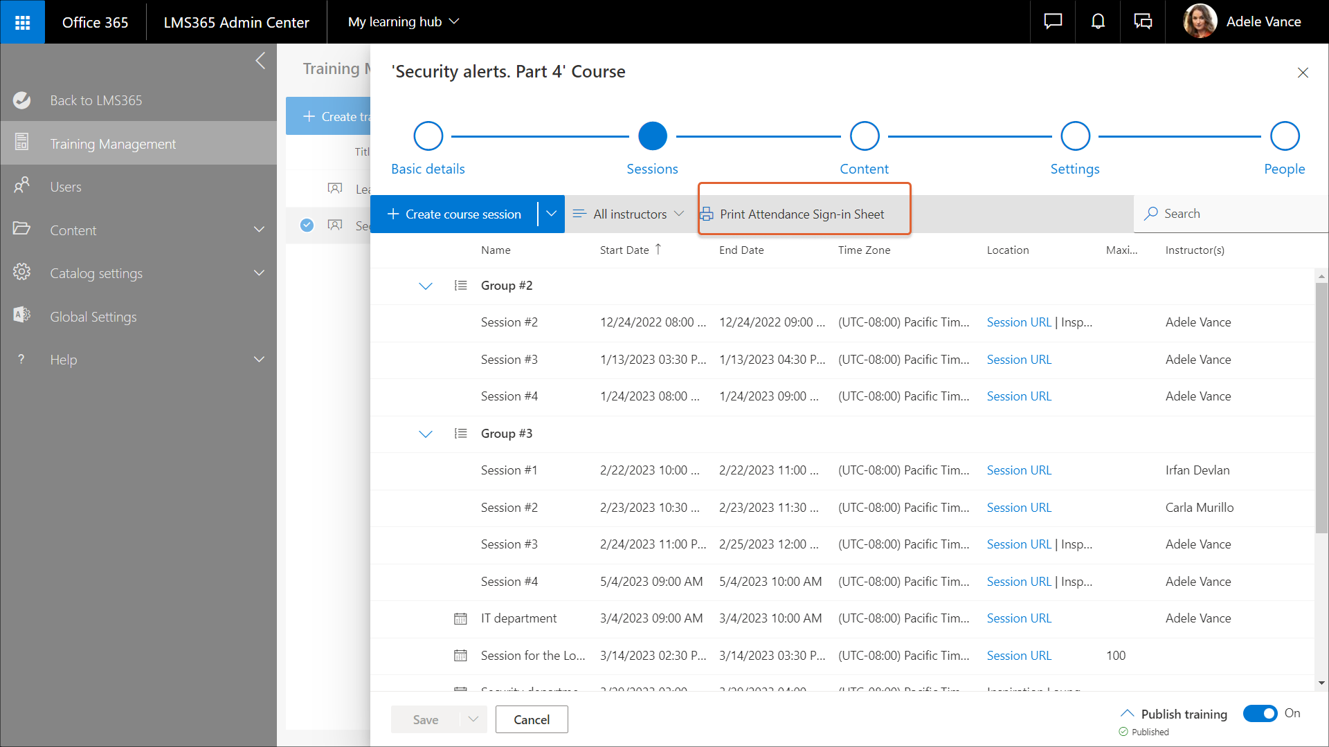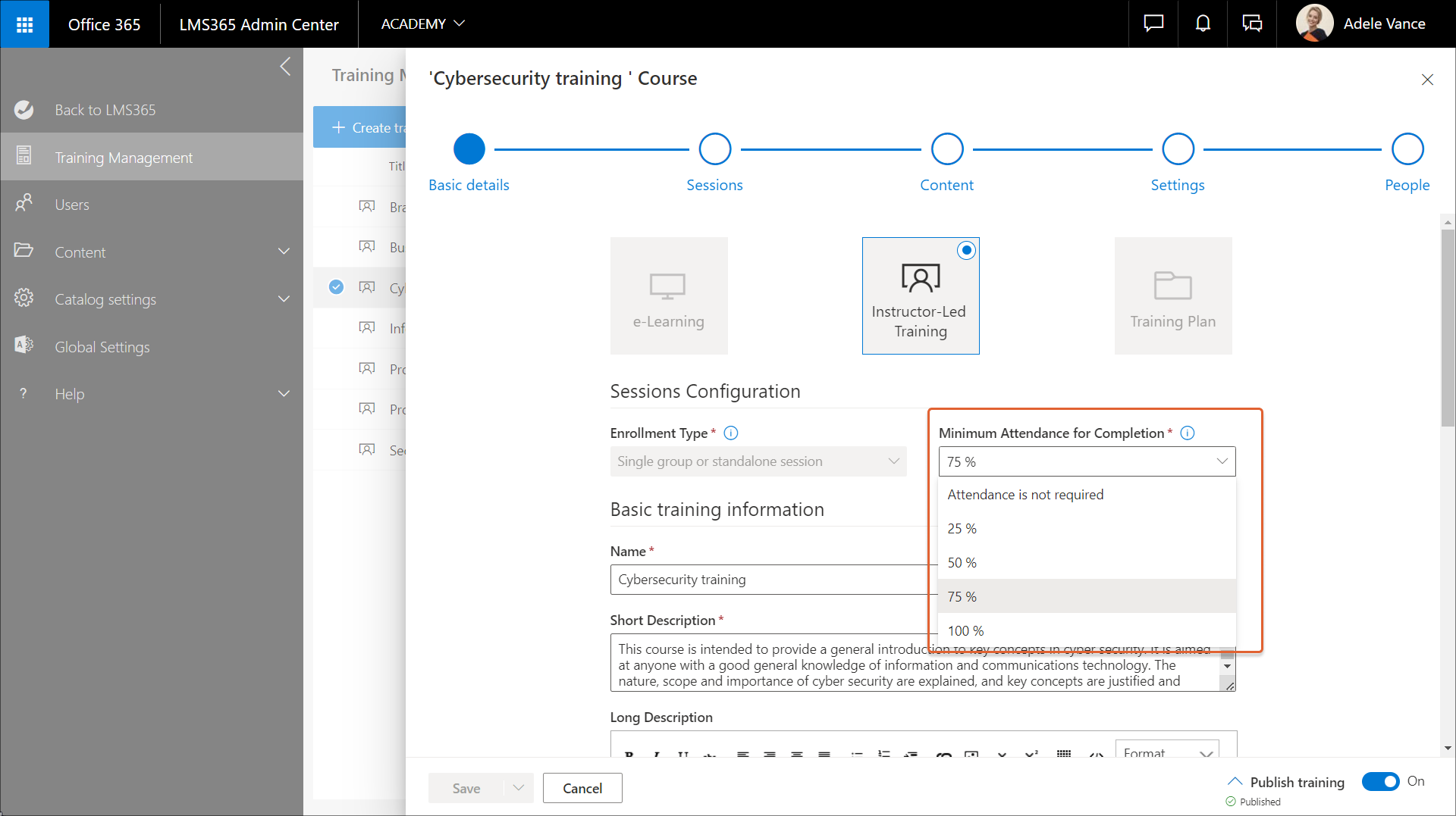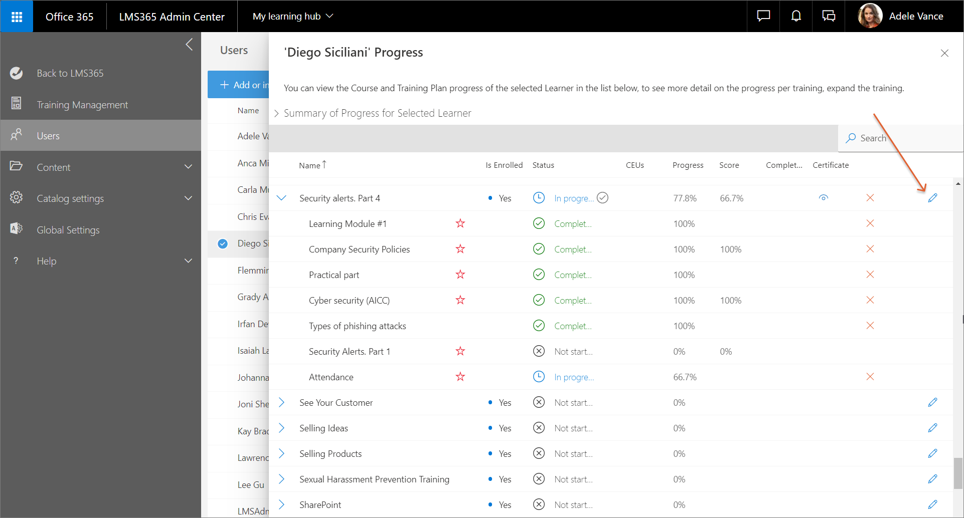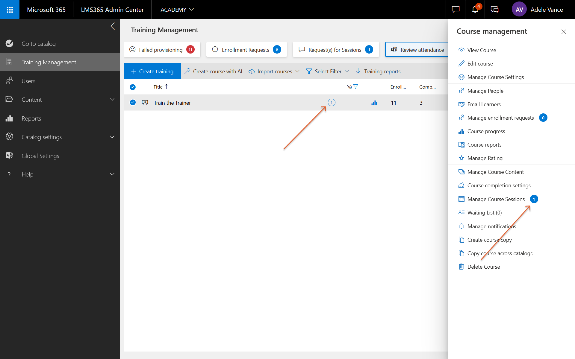 1. Gehen Sie zu Learn365 Admin Center > Schulungsverwaltung und wählen Sie den gewünschten Kurs aus.