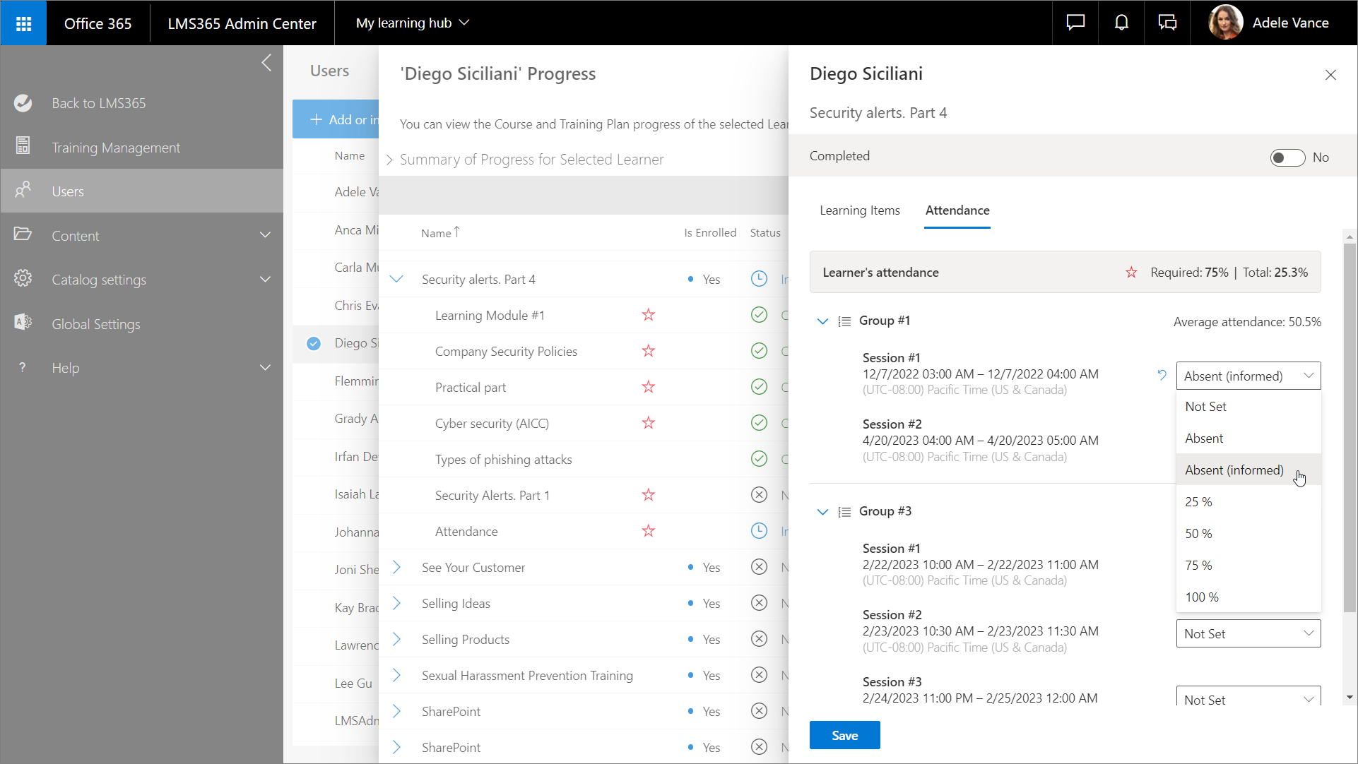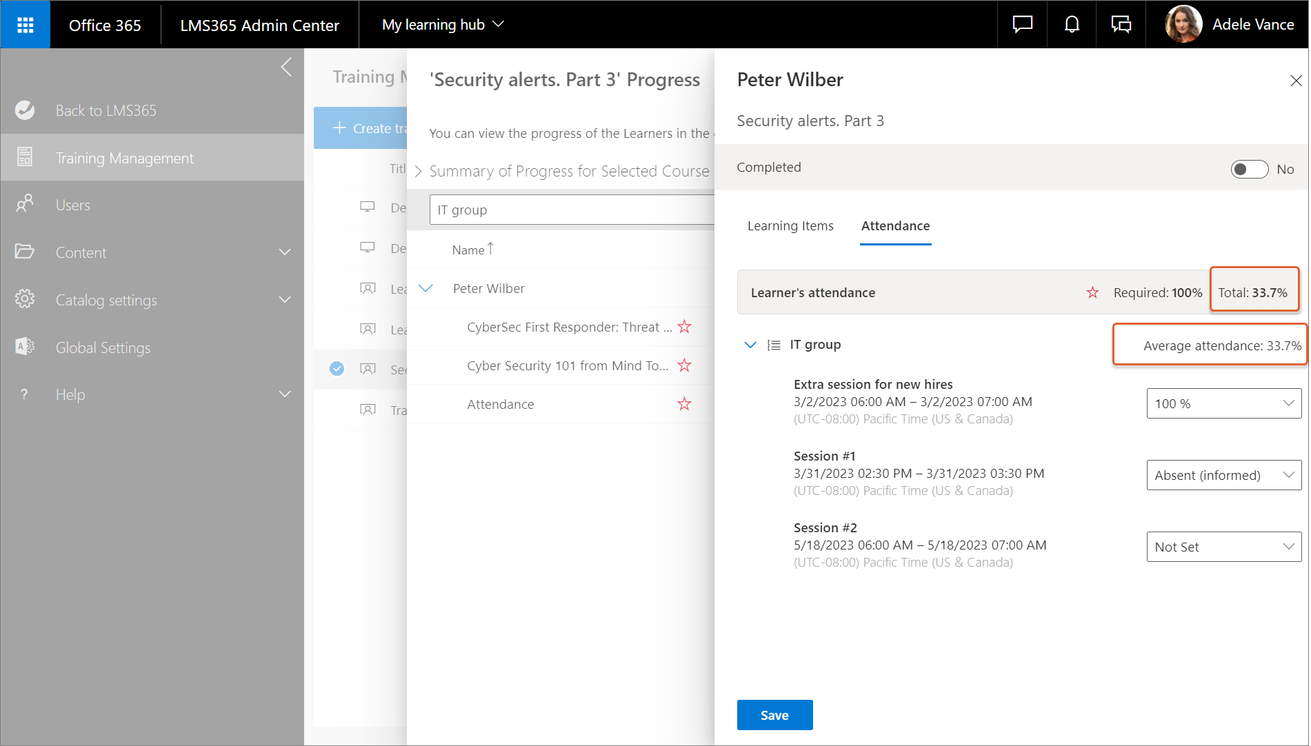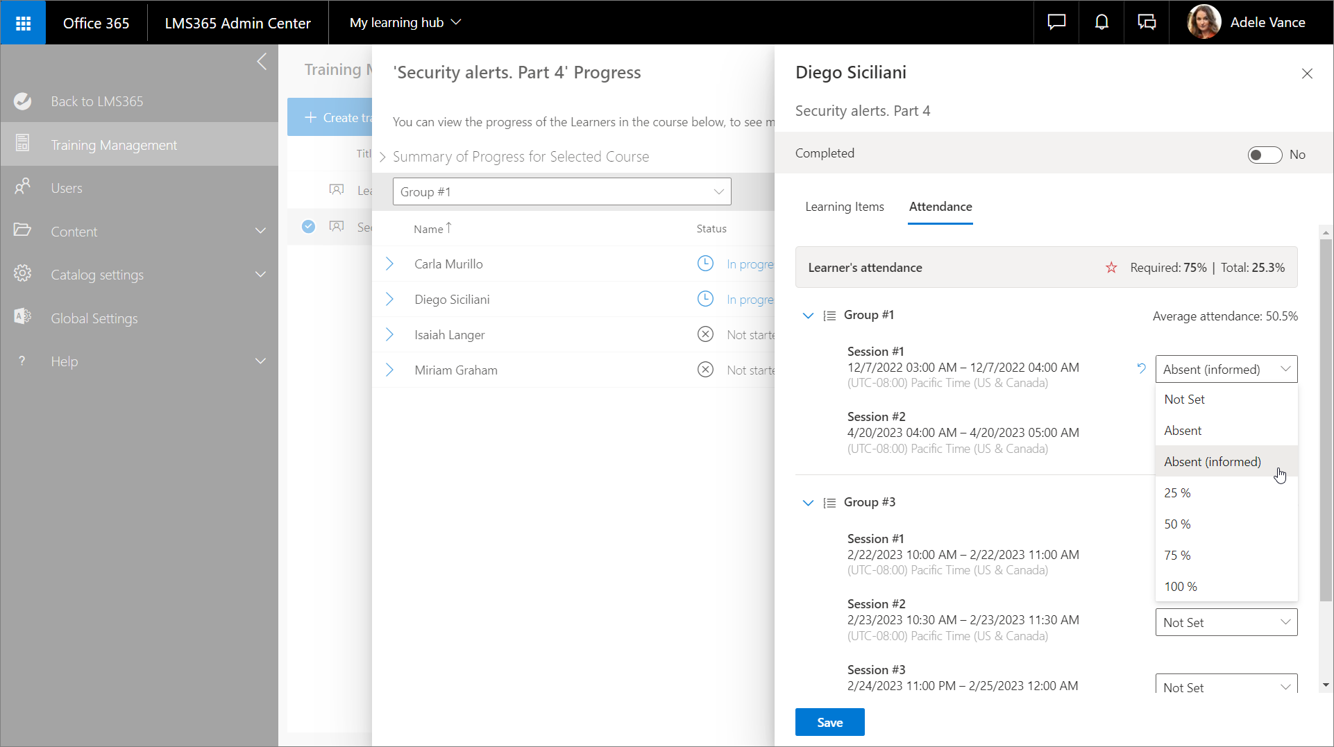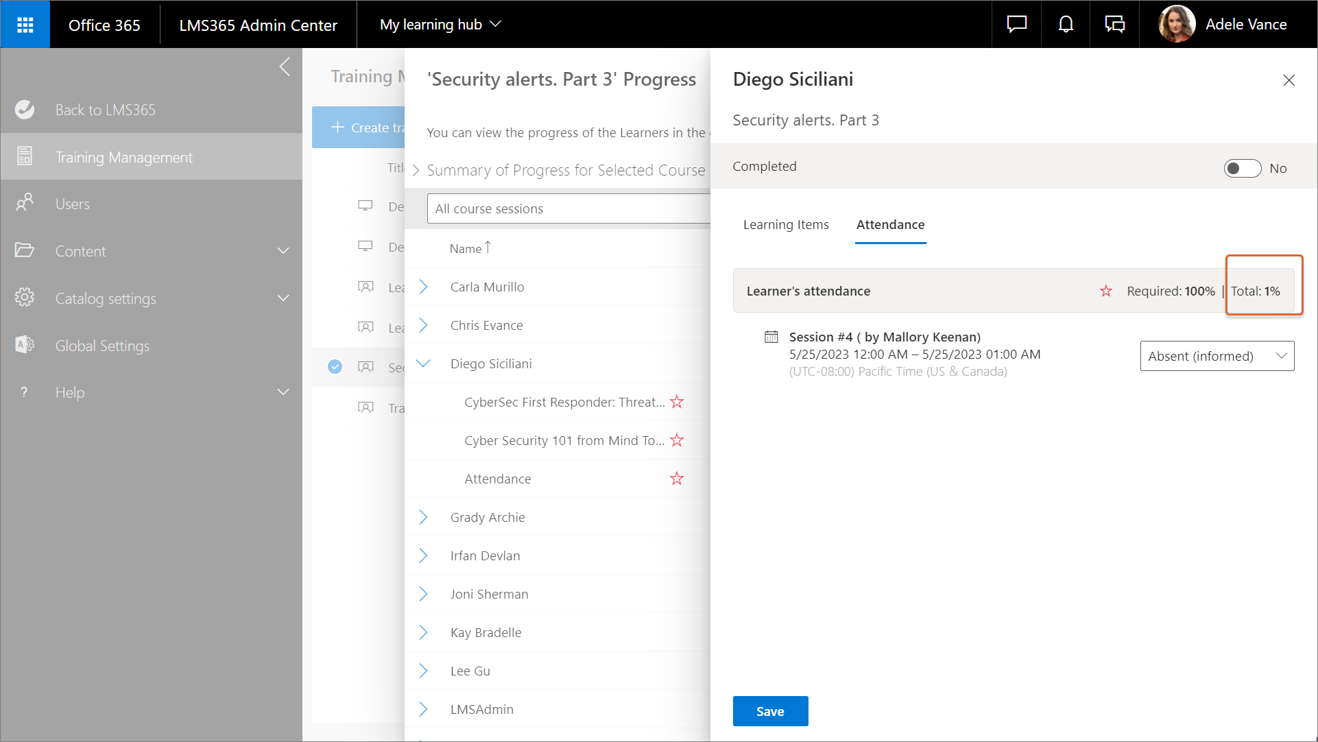 Gehen Sie zu Learn365 Admin Center > Schulungsverwaltung > Kursfortschritt und wählen Sie den gewünschten Lernenden aus. Dann aktivieren Sie die Bearbeitung des Fortschritts des Lernenden und finden den gesuchten Wert auf der Registerkarte Anwesenheit unter Insgesamt.