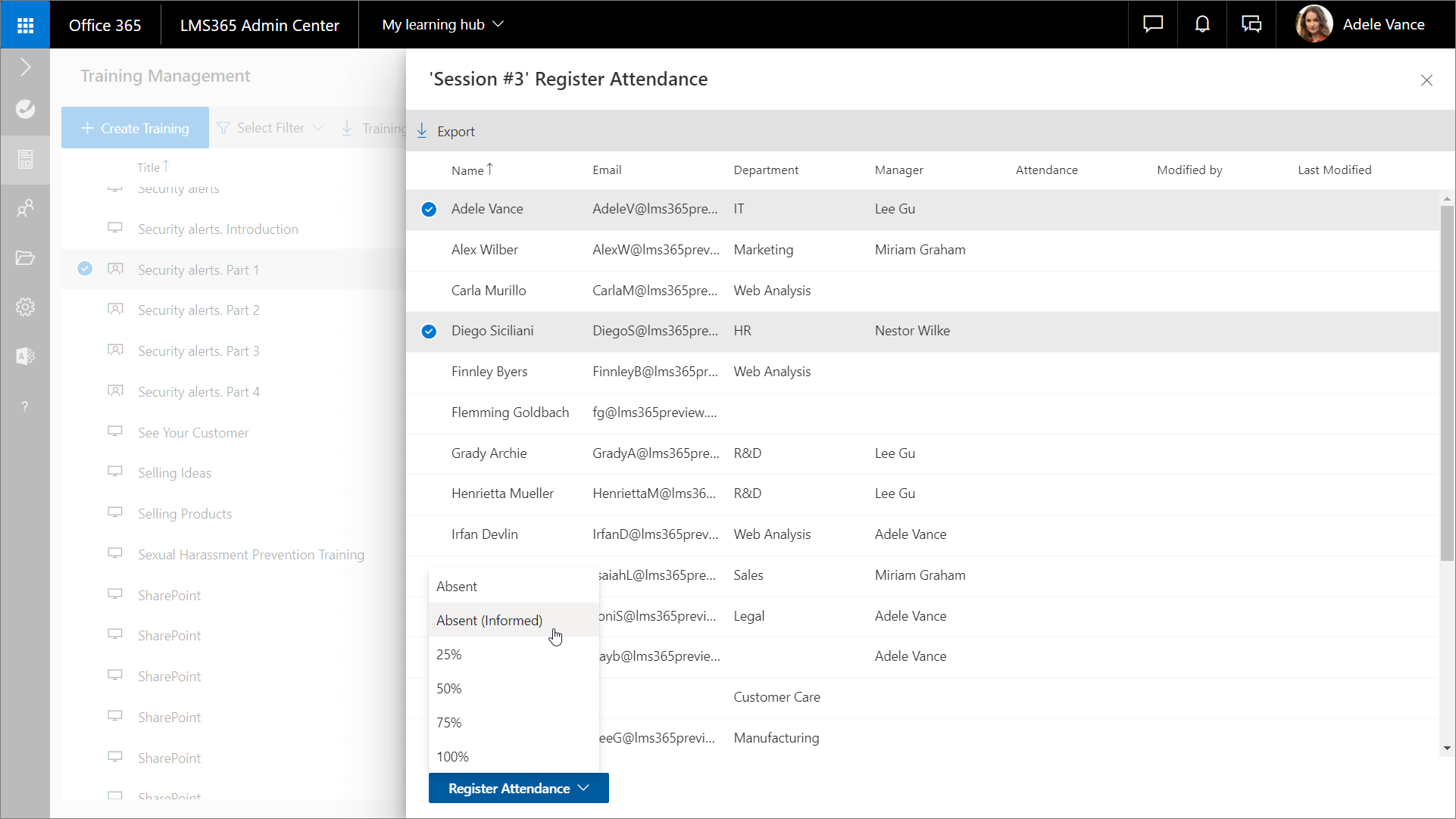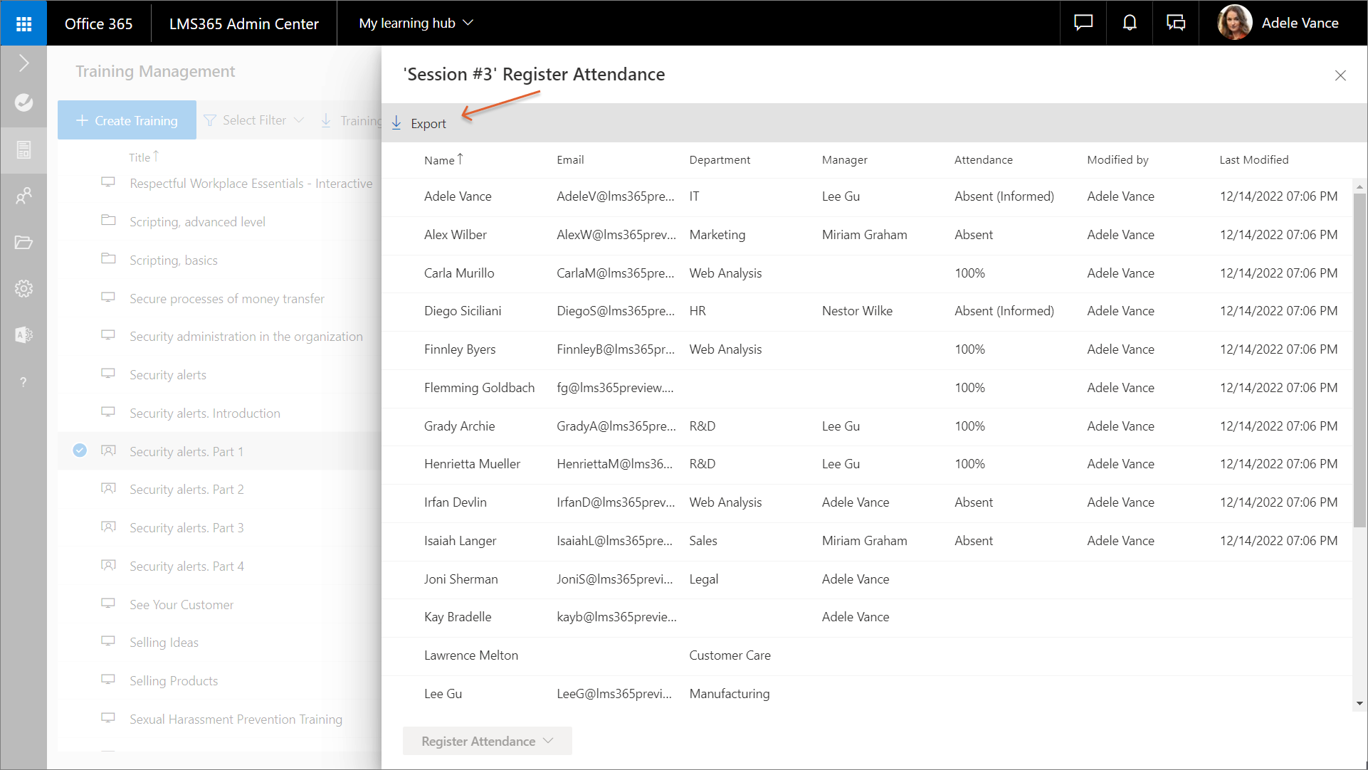 - Katalog- und Kursadministratoren sowie Sitzungsleiter können die registrierte Teilnahme an einer Sitzung (eigenständig oder in einer Gruppe) einsehen. Auch können sie eine Berichtsdatei zur Sitzungsteilnahme im Bereich Anwesenheit registrieren herunterladen.