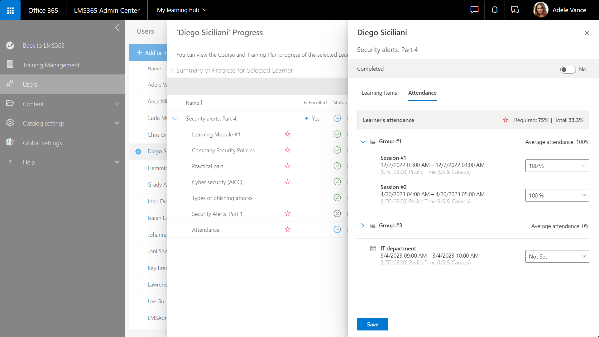 Learn365 bietet für veranstaltungsbasierte Schulungen eine einfache und bequeme Möglichkeit, die Anwesenheit von Lernenden bei Sitzungen, die entweder eigenständig oder Teil einer Sitzungsgruppe sind, zu registrieren und nachzuverfolgen. Mit dieser Option können Administratoren den allgemeinen Fortschritt der Lernenden effektiv im Blick behalten, nachvollziehen, welche Sitzungen ein Lernender besucht hat, und abwesende Lernende registrieren.