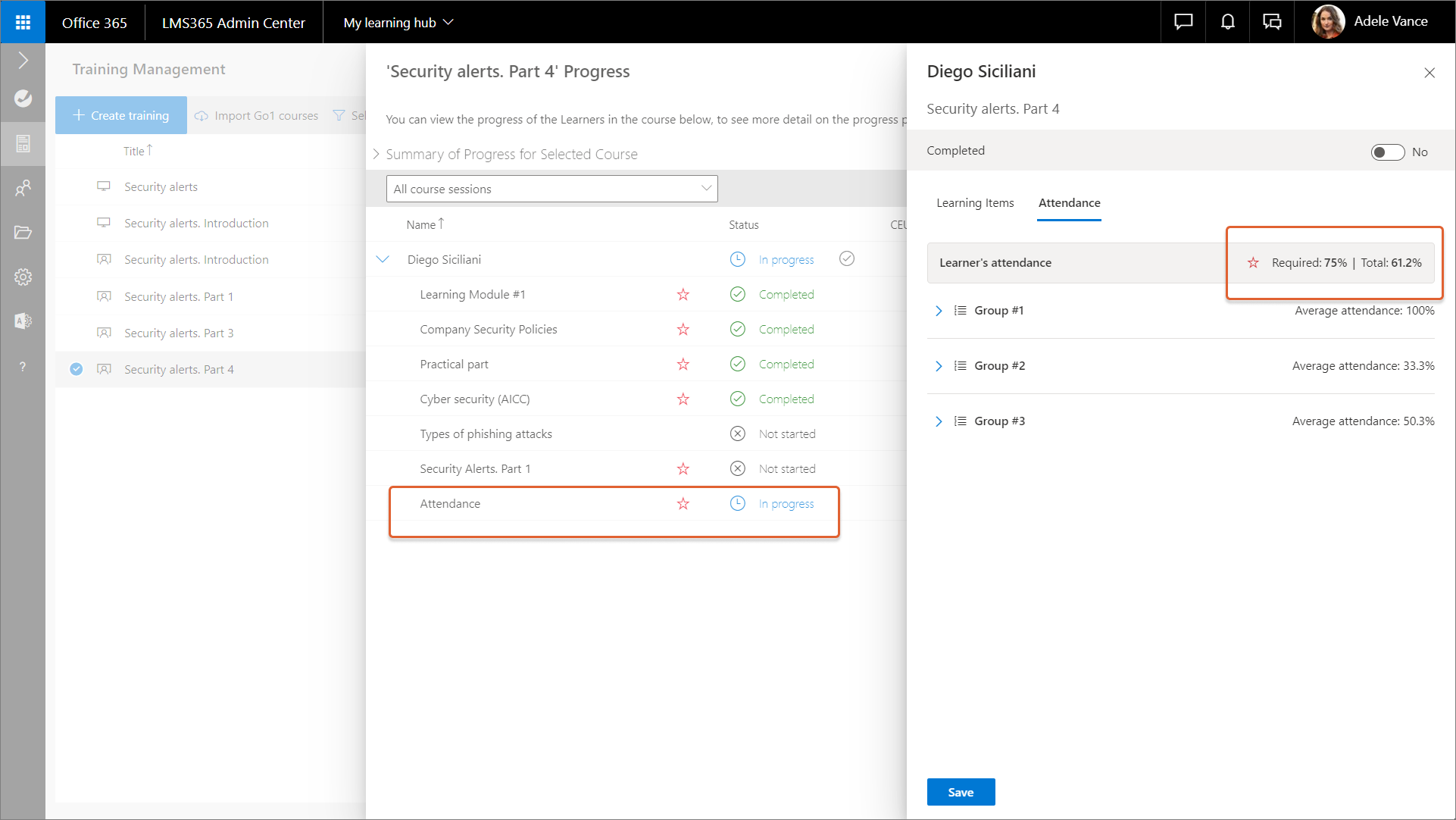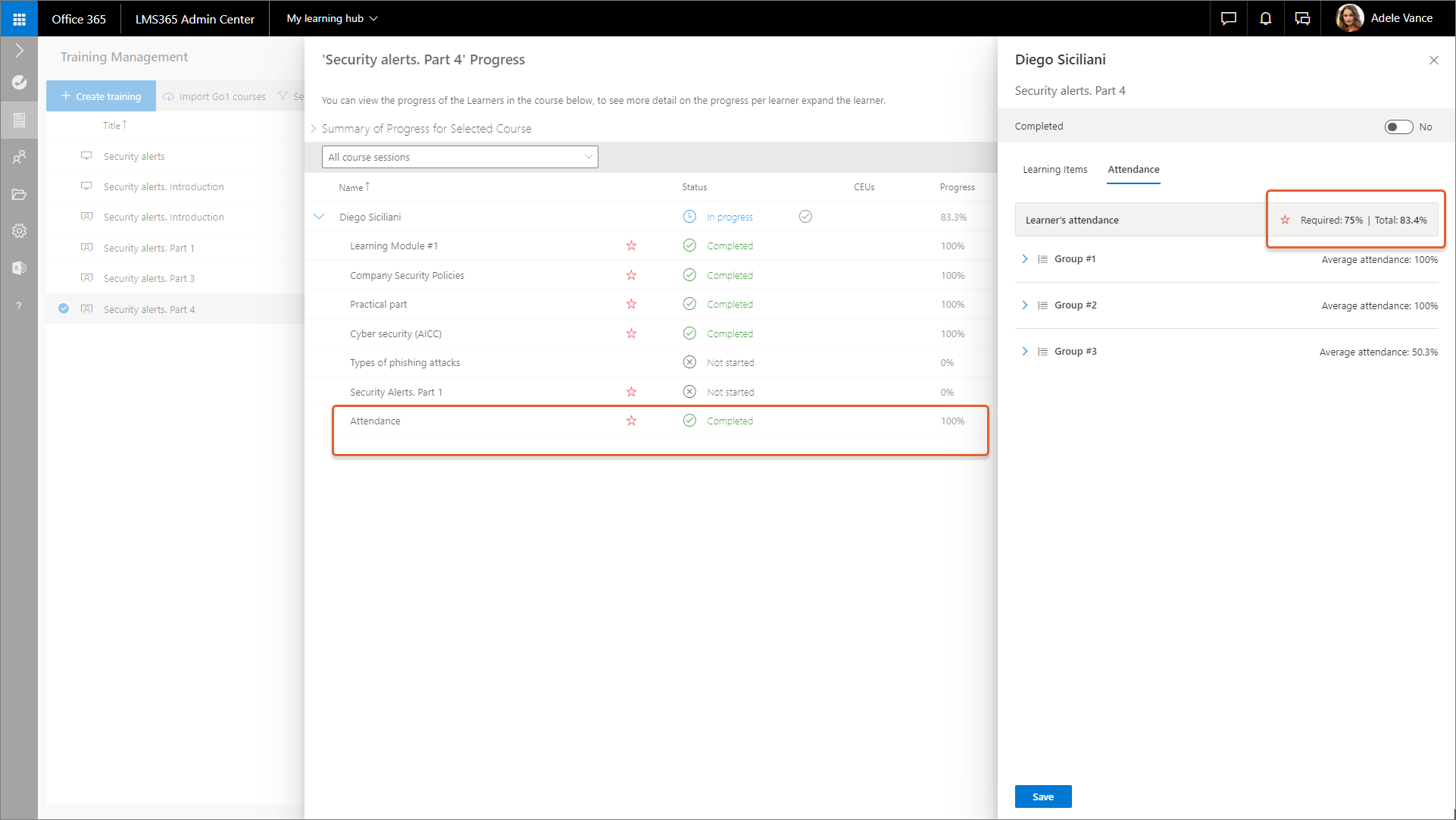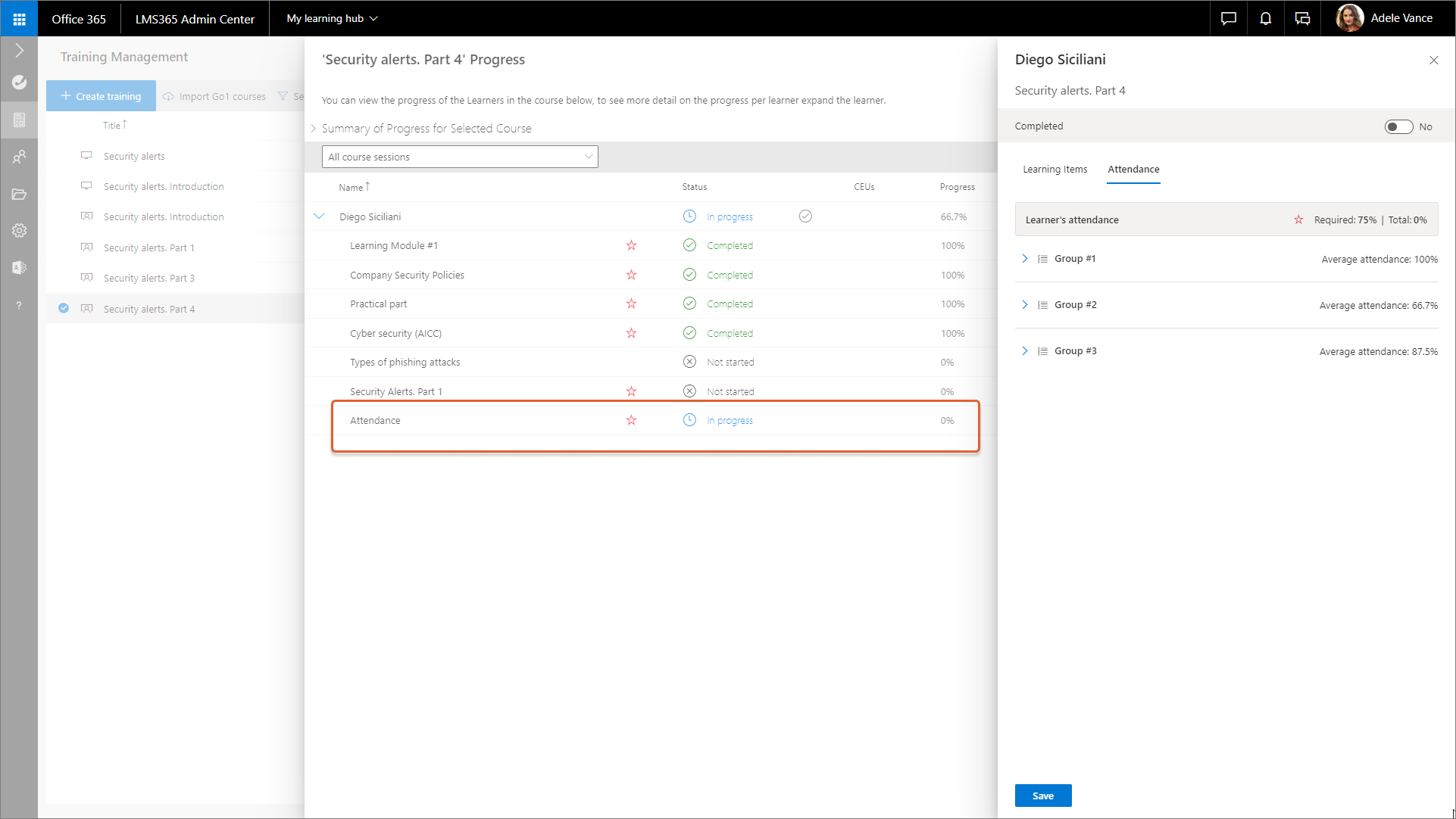 Informationen dazu, wie der Anwesenheitsfortschritt in die Berechnung des Gesamtfortschritts veranstaltungsbasierter Schulungen einbezogen wird, finden Sie in diesem Artikel.