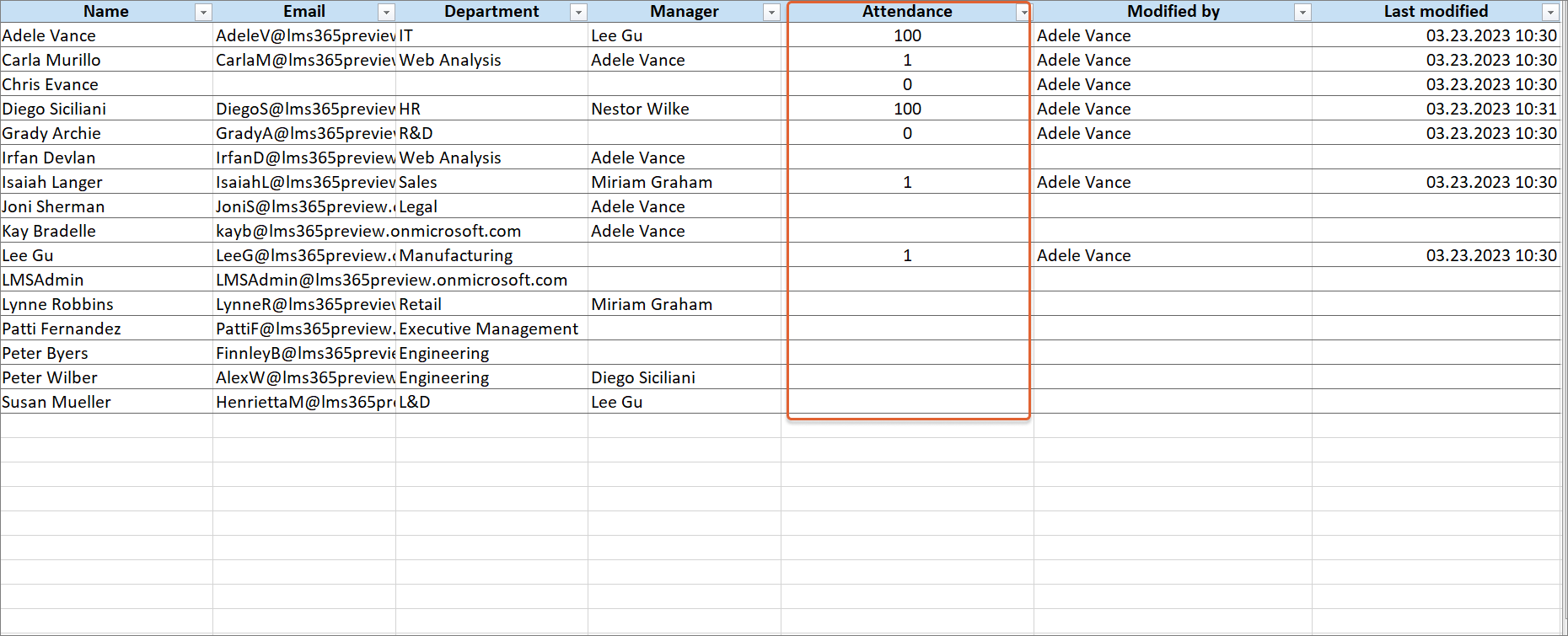 - Im Bereich Benutzer können Katalogadministratoren die per Unterschrift registrierte Anwesenheit einsehen. Dieser Bereich enthält die Unterschriften der Lernenden selbst nicht, weist jedoch einen Wert von 100 % für die Anwesenheitsregistrierung aus, wenn der Lernende seine Anwesenheit per Unterschrift bestätigt hat.