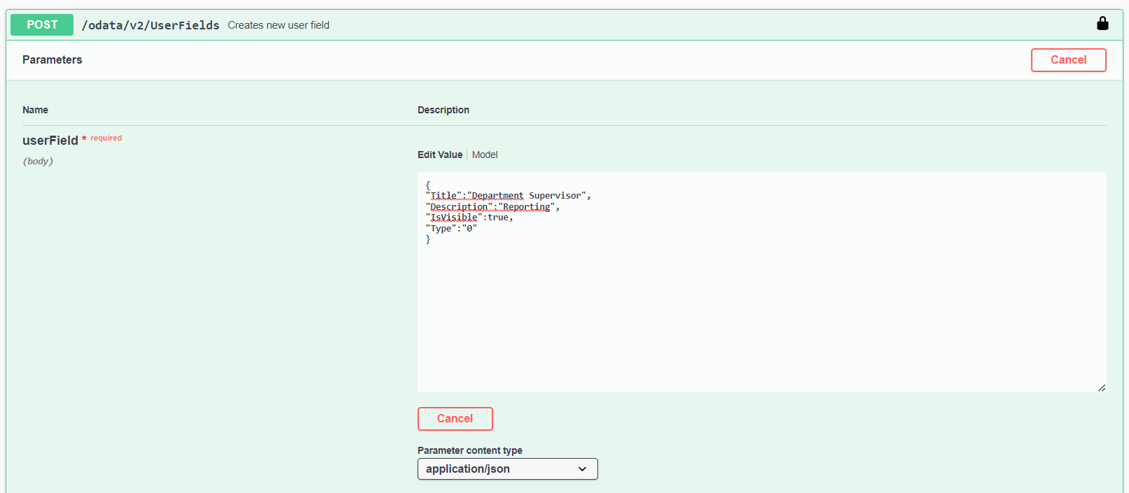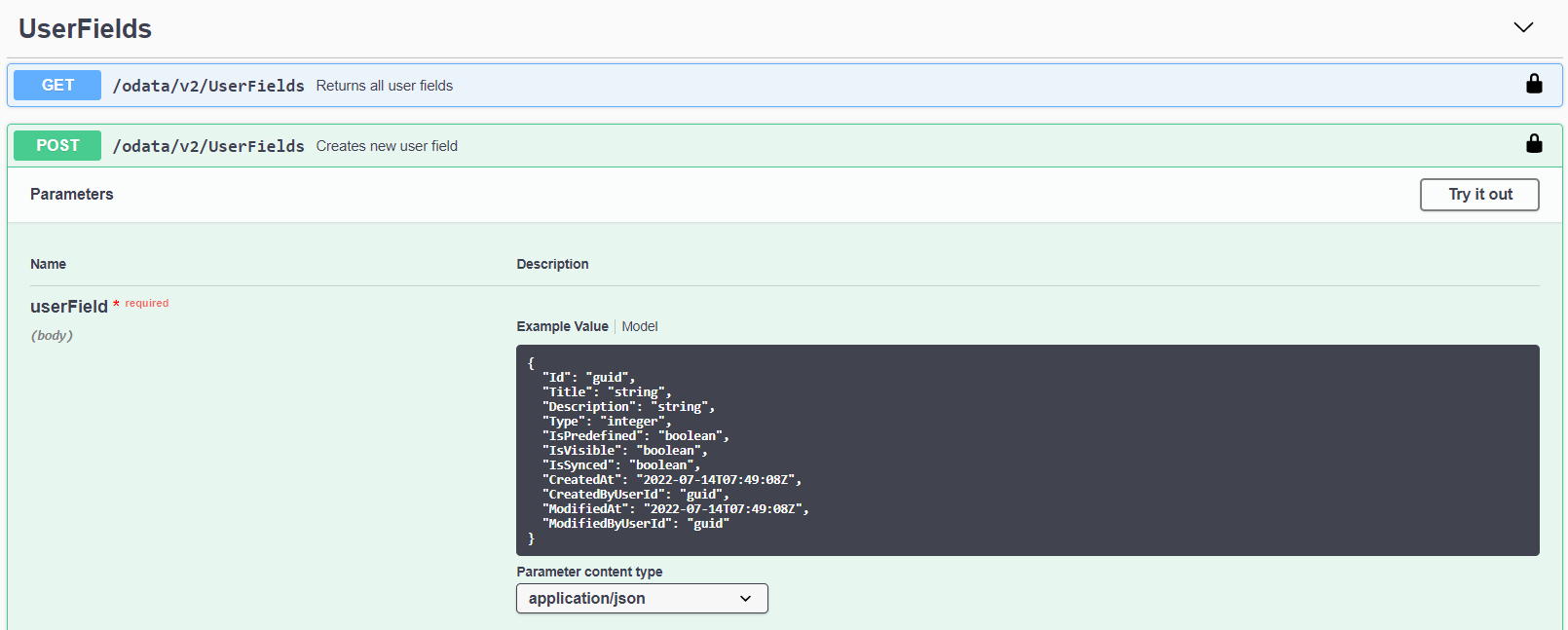 2. Suchen und erweitern Sie den Abschnitt UserFields, suchen Sie die Methode POST /odata/v2/UserFields mit der Beschreibung Creates new user field und wählen Sie dann oben links Try it out aus.