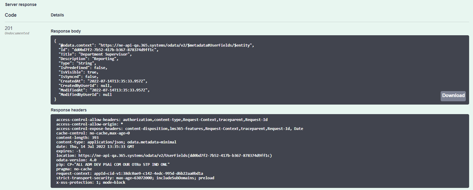 - Im Feld Response body werden die Ergebnisse der Anfrage angezeigt. Die Spalte wird erstellt, was unter LMS-Konfiguration > Benutzerspalten sowie im Bereich Benutzer überprüft und (mit Ausnahme des Spaltentyps) konfiguriert werden kann.