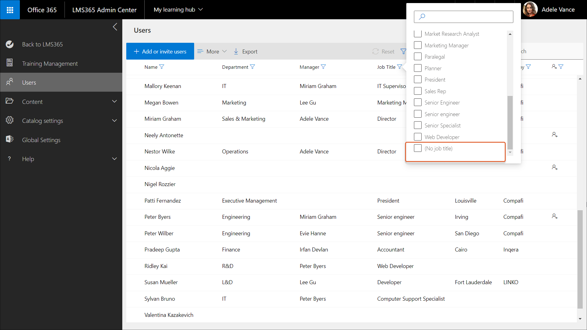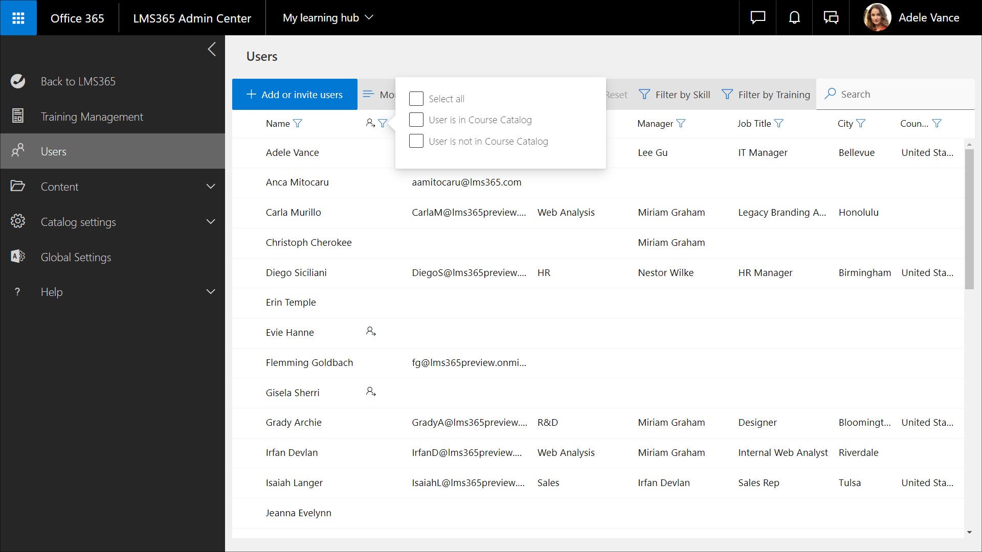 Katalogadministratoren können die Spalten der Liste anpassen, indem sie zwischen den Spalten auswählen, die von einem LMS-Administrator oder einem globalen Microsoft 365-Administrator unter Globale Einstellungen > LMS-Konfiguration > Benutzerspalten vordefiniert wurden.