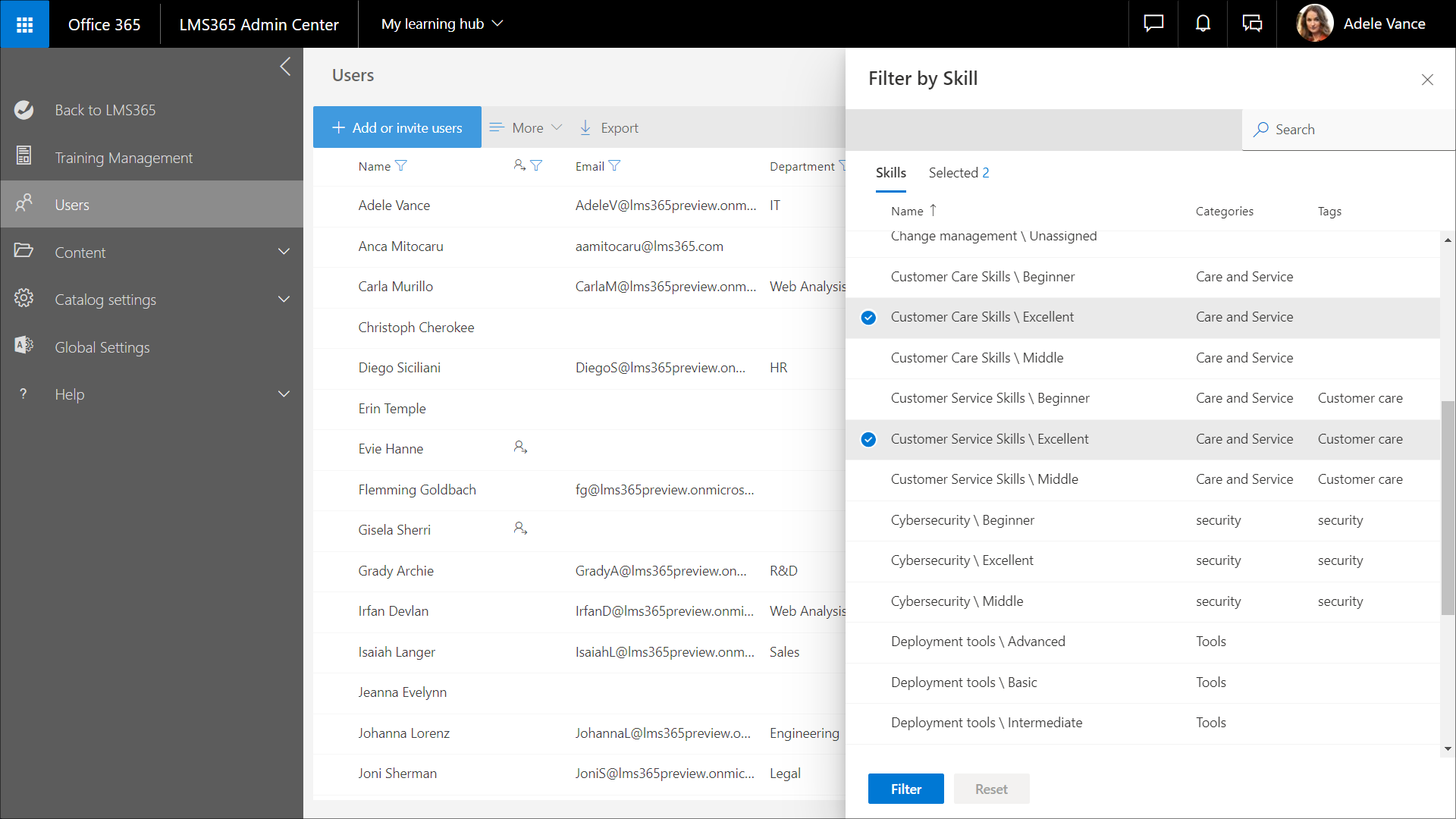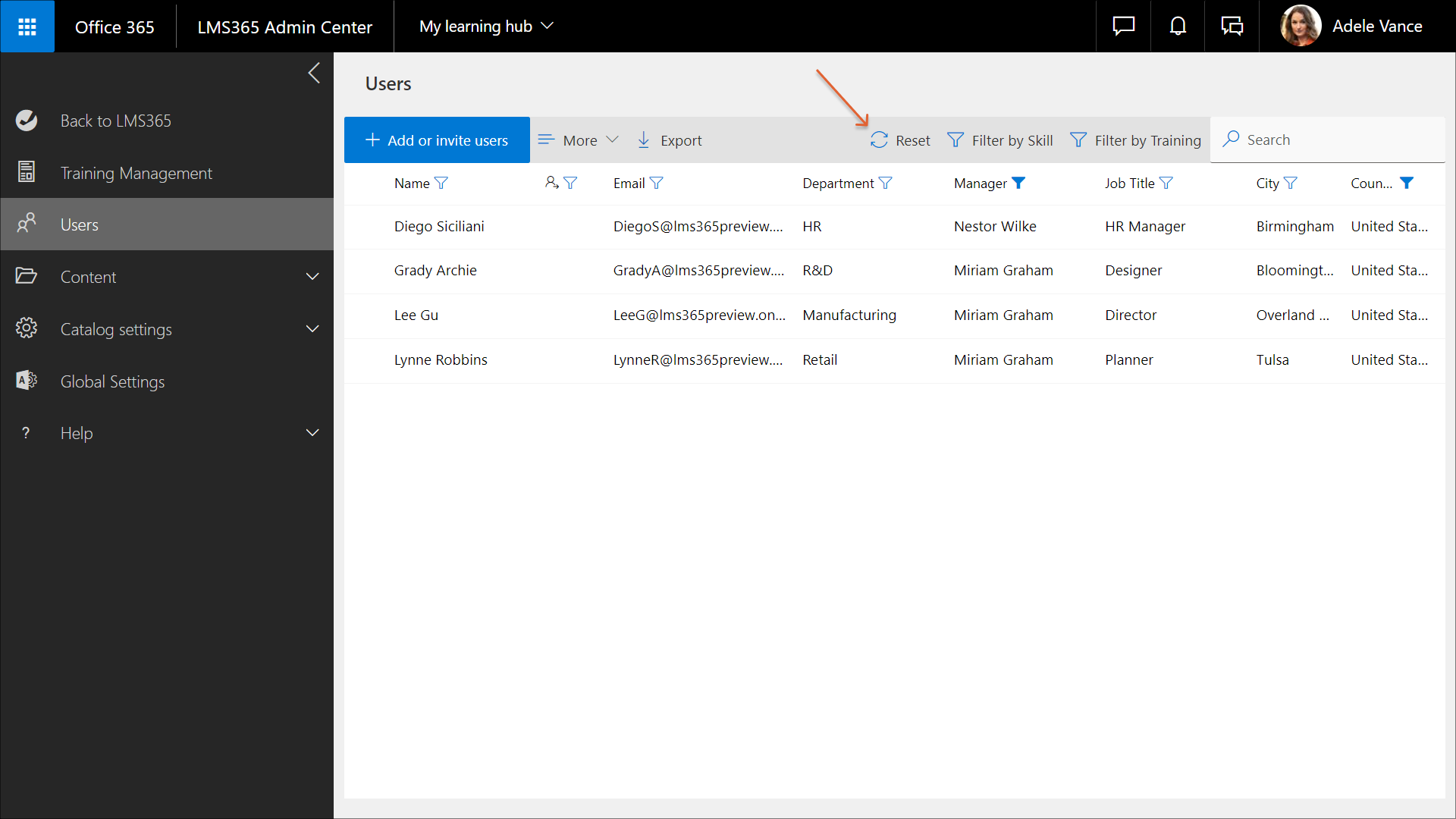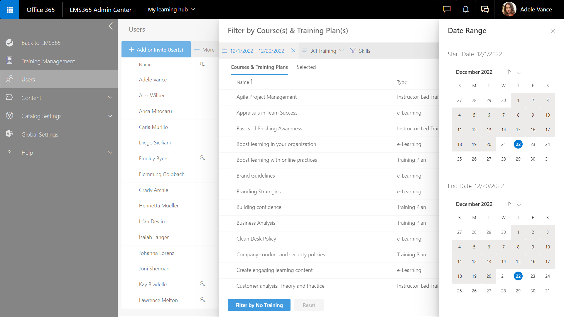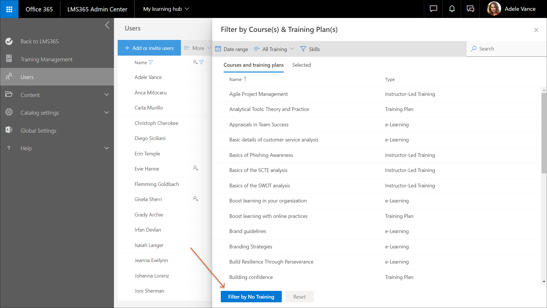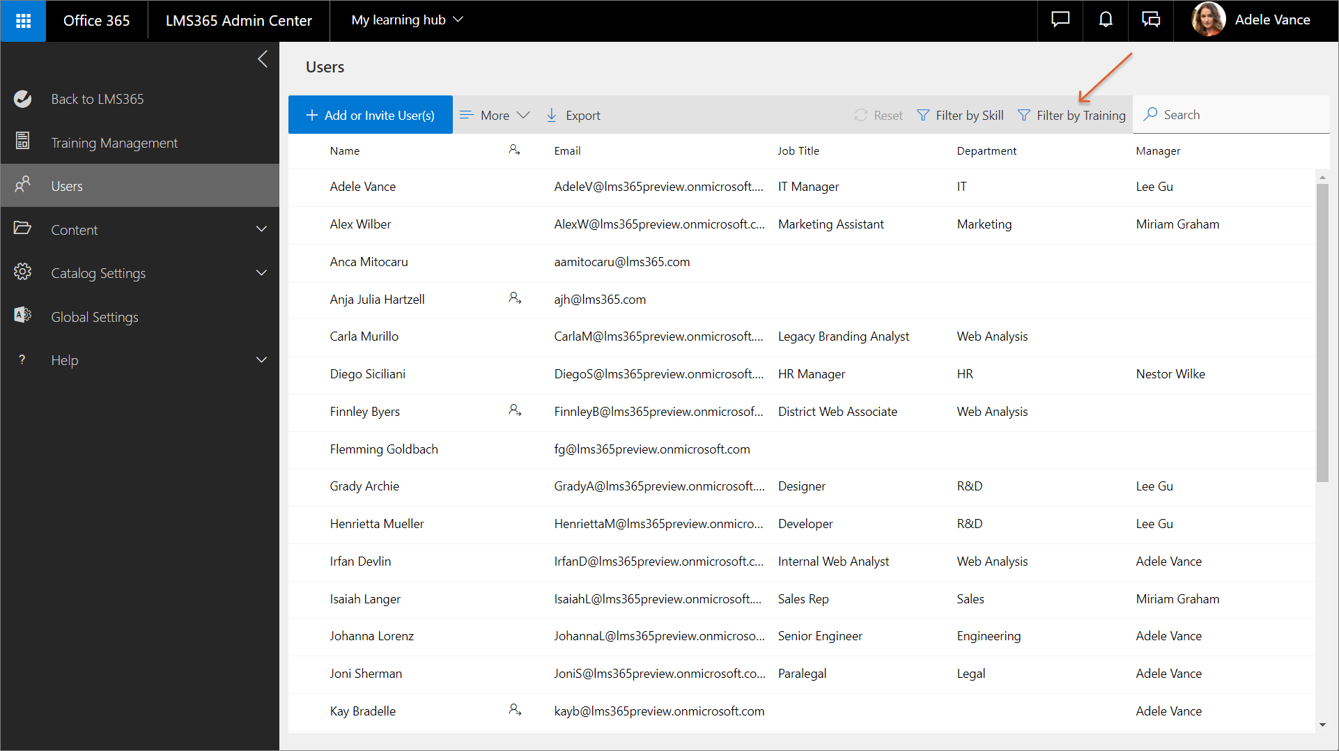 1. Wählen Sie auf der Seite Benutzer die Option Nach Schulung filtern aus.