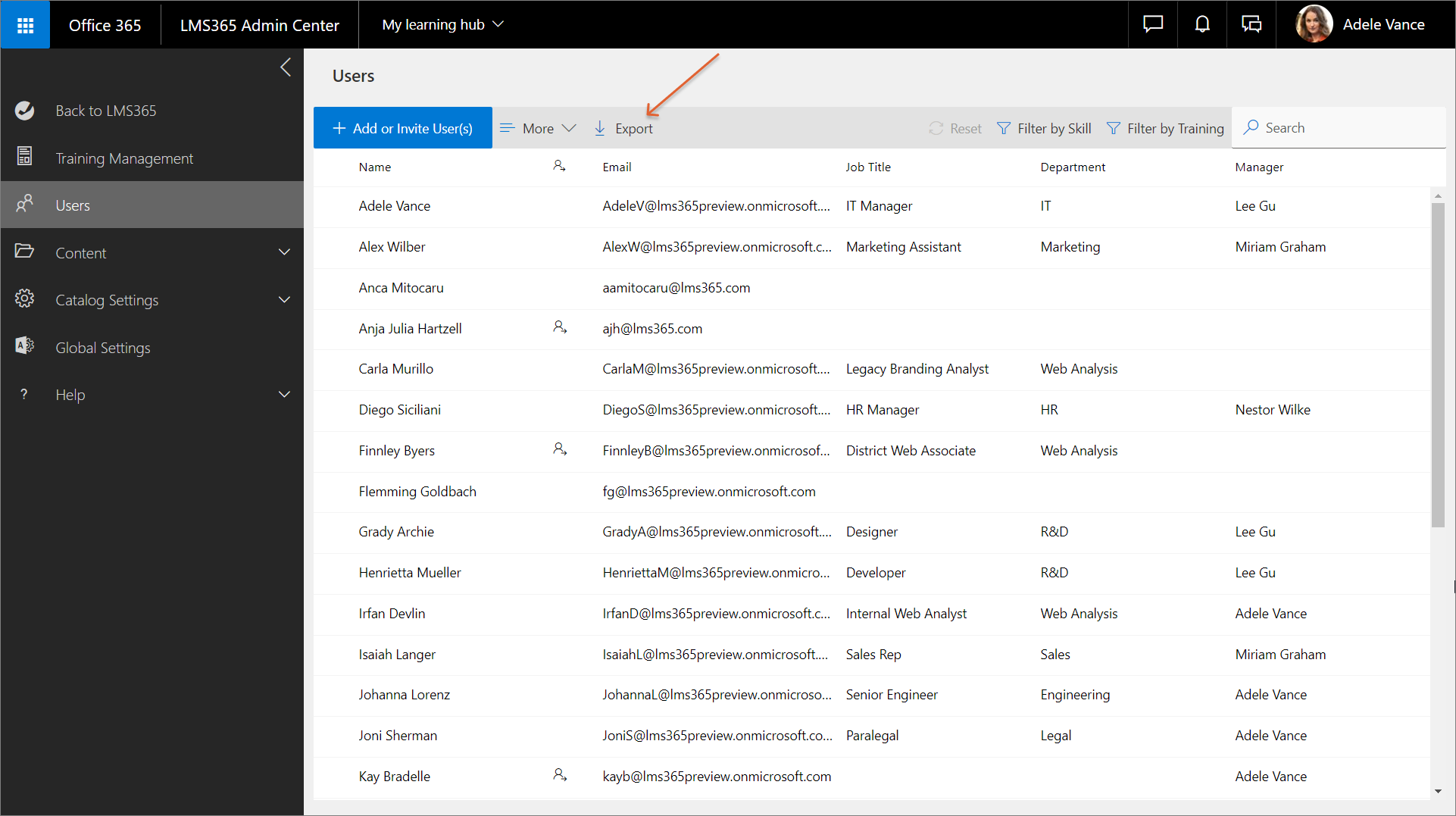 Durch Klicken auf Exportieren können Sie die gefilterten Benutzer aus dem Bereich Benutzer auf Ihr Gerät herunterladen. Der Bericht zeigt Informationen in der Sprache Ihres Browsers an, sofern diese Sprache von Learn365 unterstützt wird. Andernfalls erfolgt die Anzeige der Informationen auf Englisch (USA).