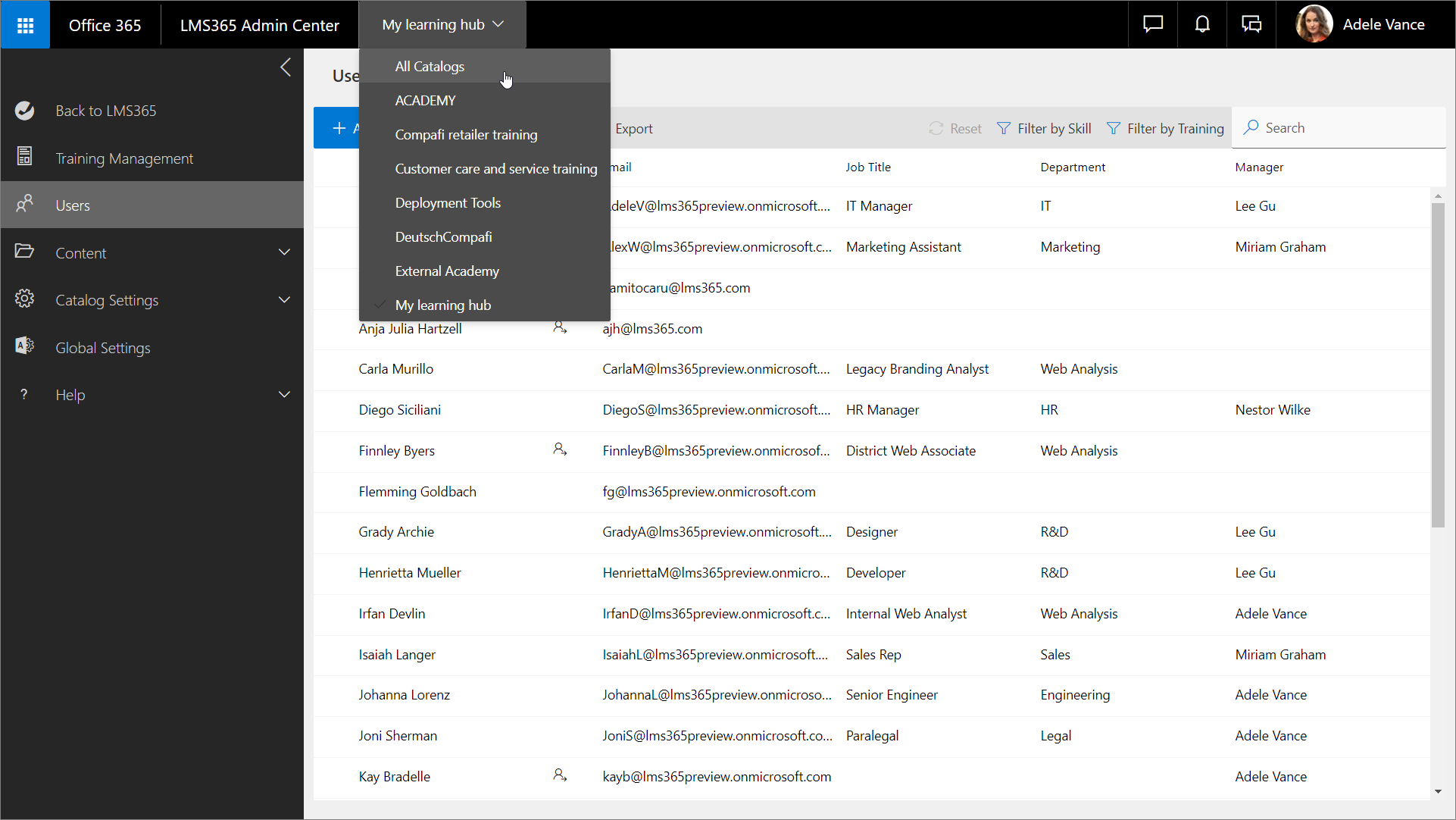 Die Option Alle Kataloge ist für Katalogadministratoren verfügbar, die zusätzlich die Rolle eines LMS-Administrators, eines globalen Microsoft 365-Administrators oder eines SharePoint-Administrators haben. Die Auswahl Alle Kataloge leitet Sie zur Seite Kurskatalogverwaltung im Learn365 Admin Center weiter.