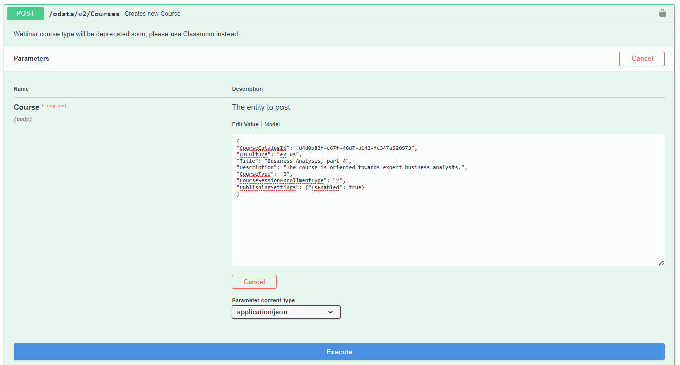 2. Wählen Sie den Endpunkt POST /odata/v2/Courses zum Erstellen neuer Kurse und Schulungspläne aus und klicken Sie auf Try it out.