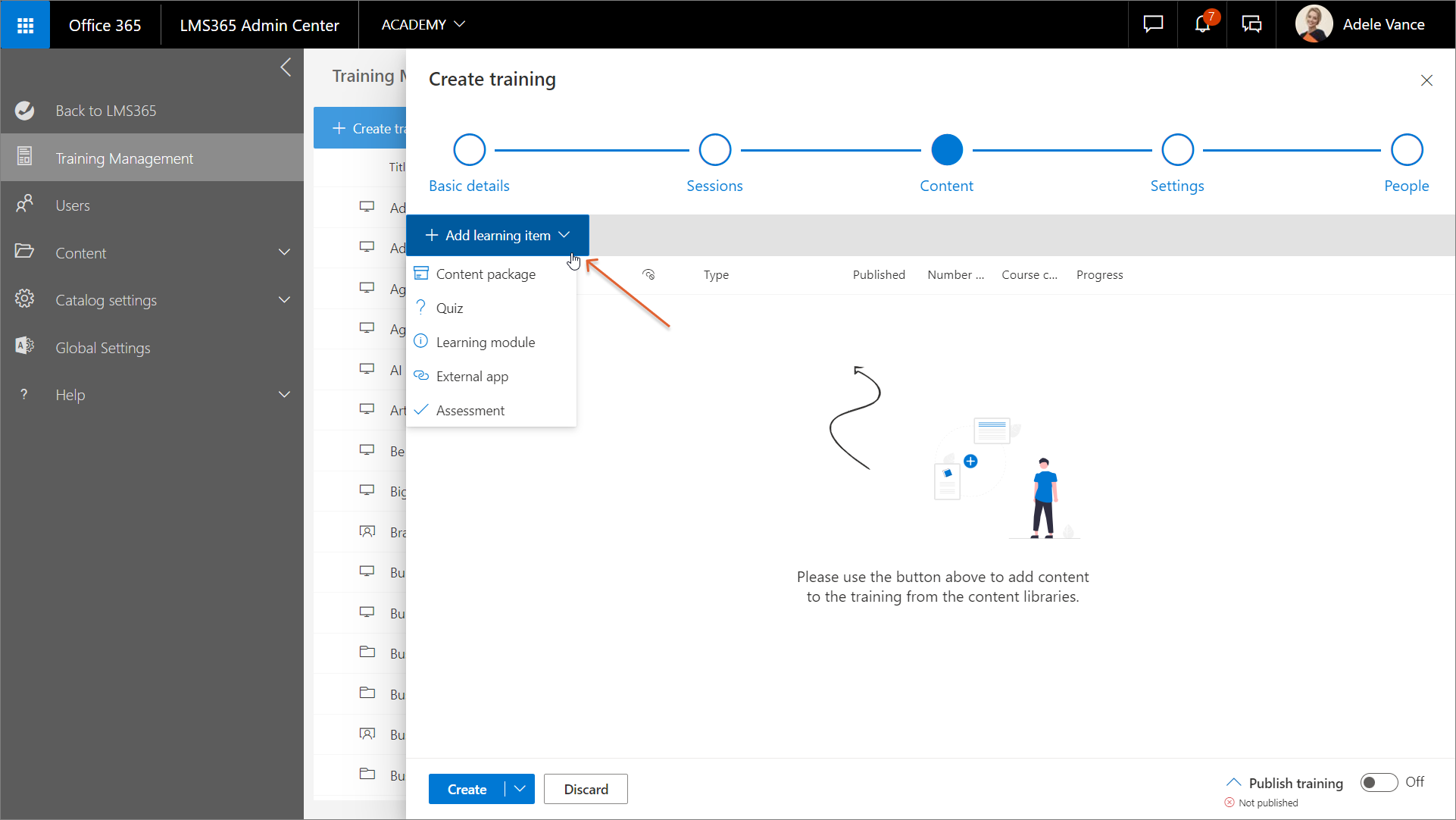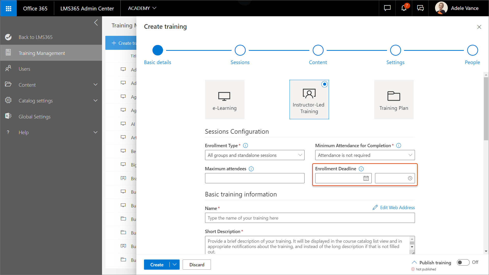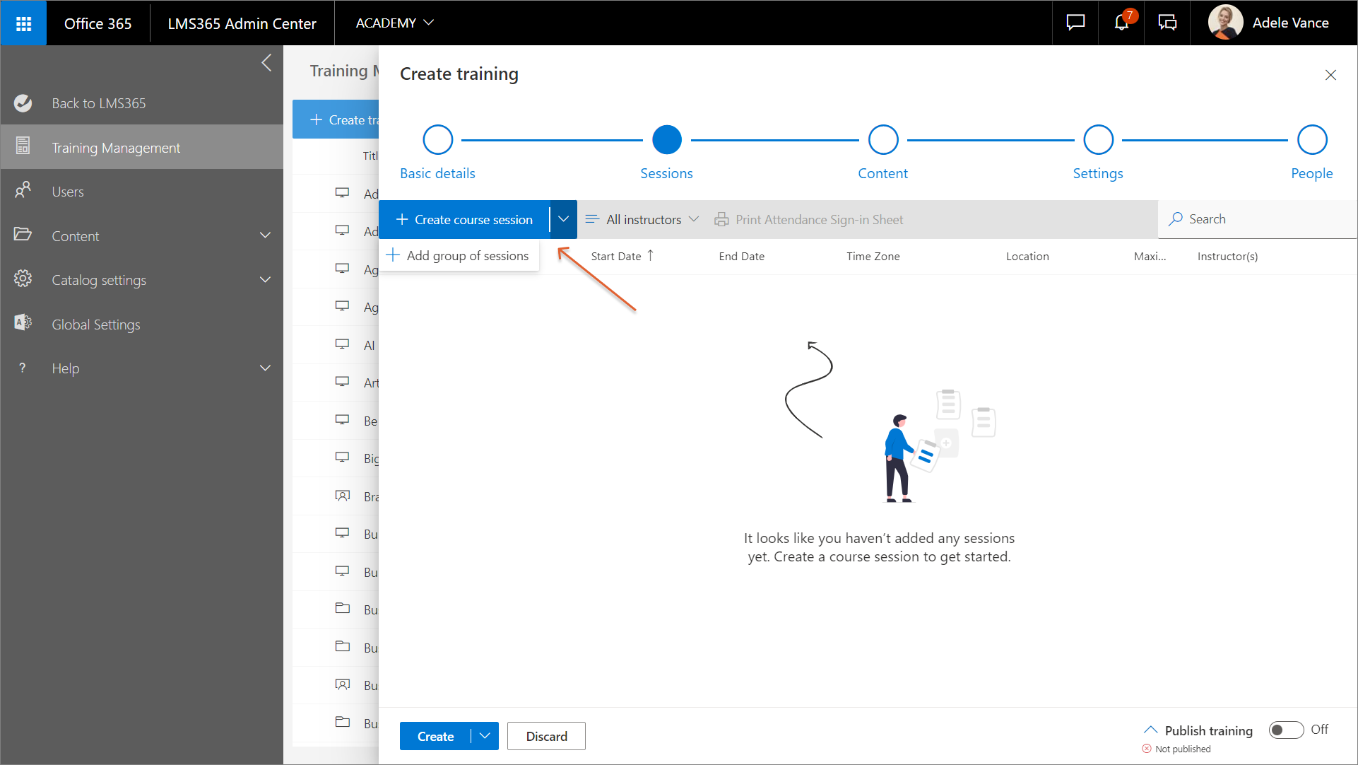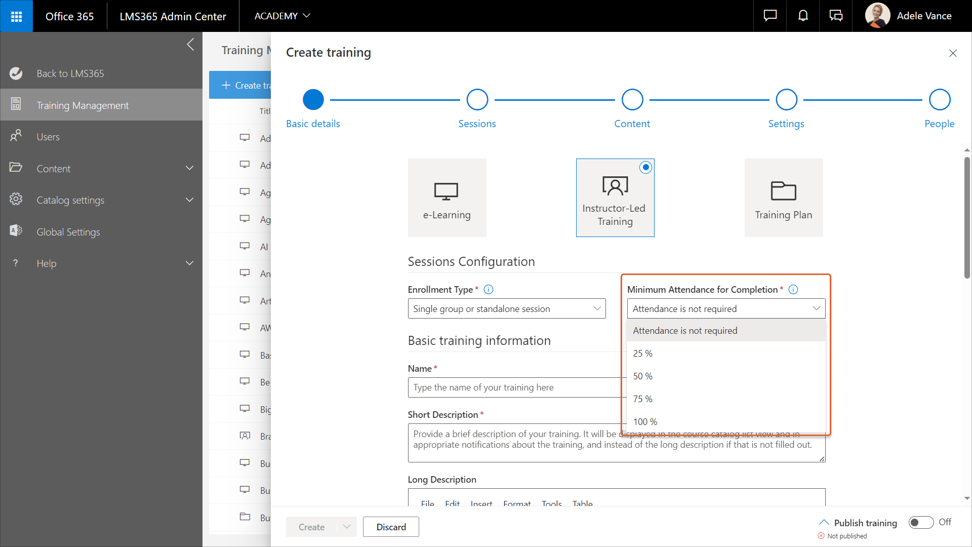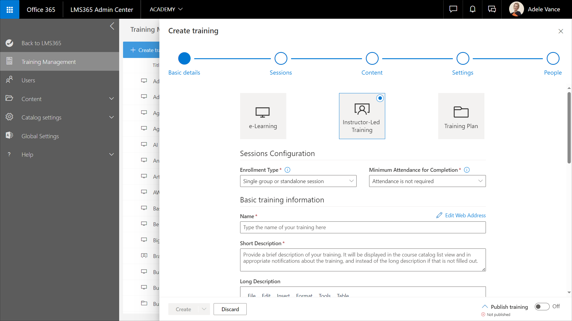 Zum Erstellen einer veranstaltungsbasierten Schulung wählen Sie Learn365 Admin Center > Schulungsverwaltung > Schulung erstellen aus.
