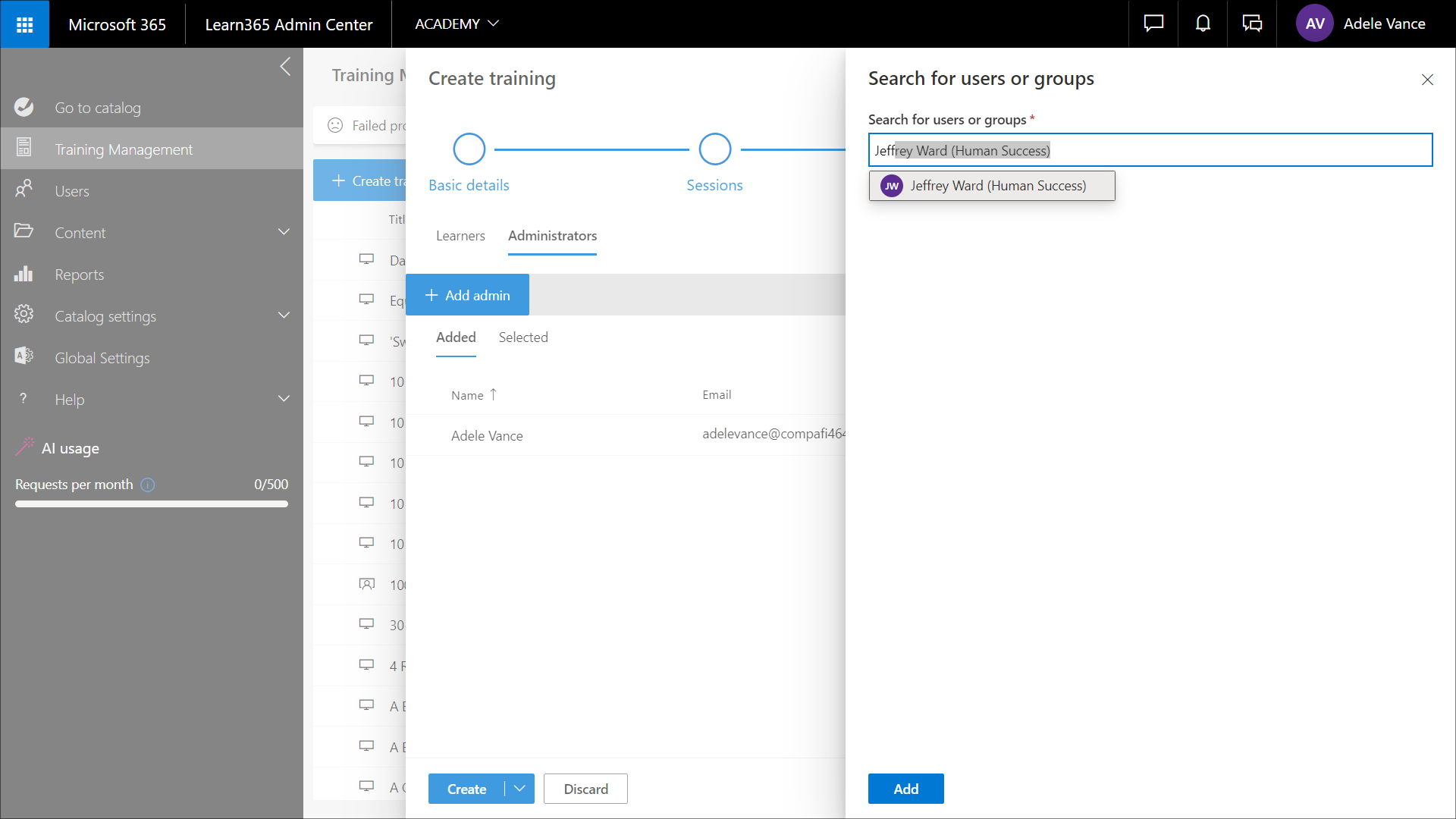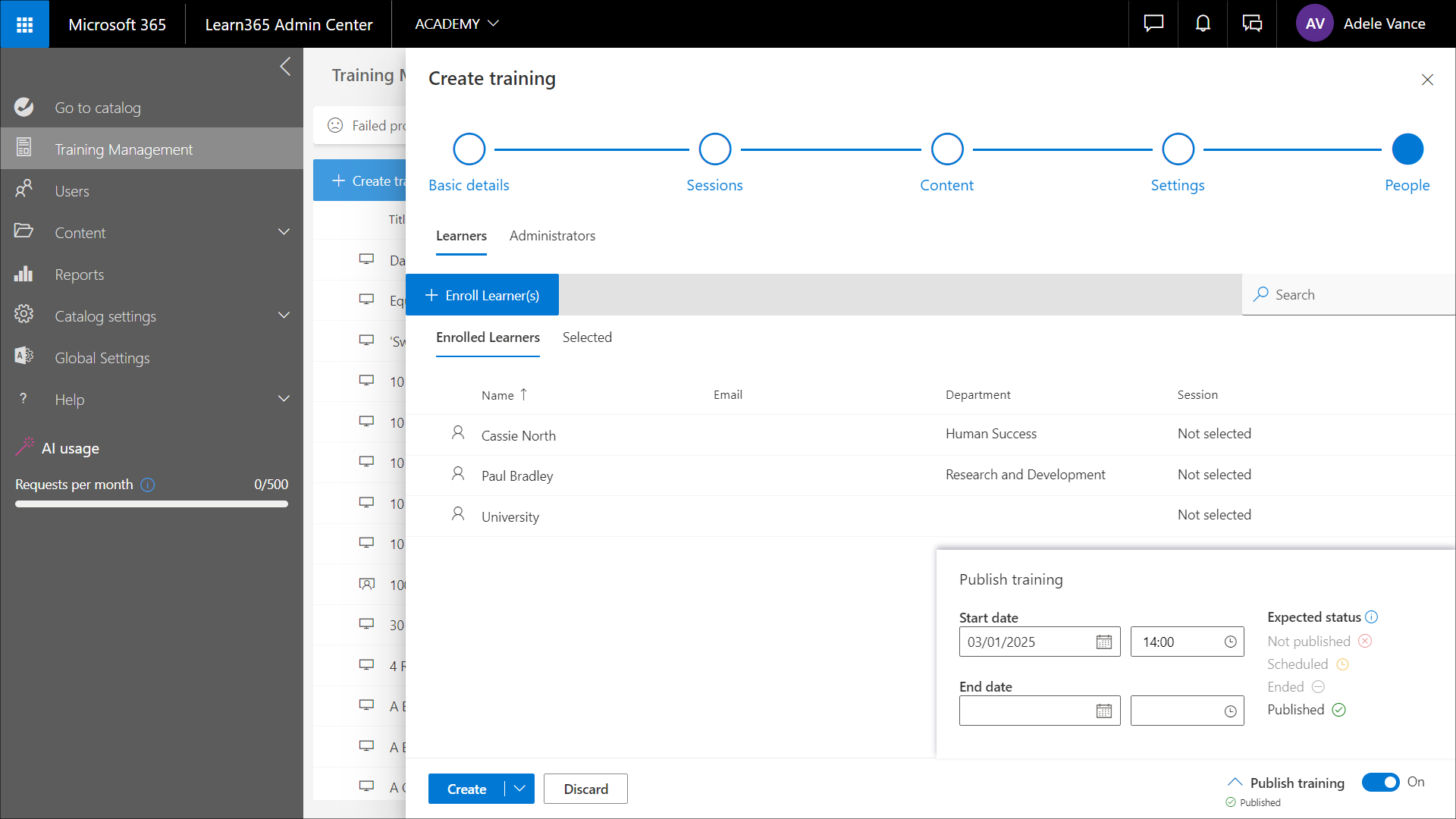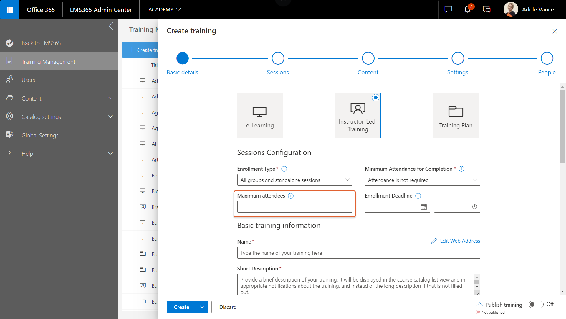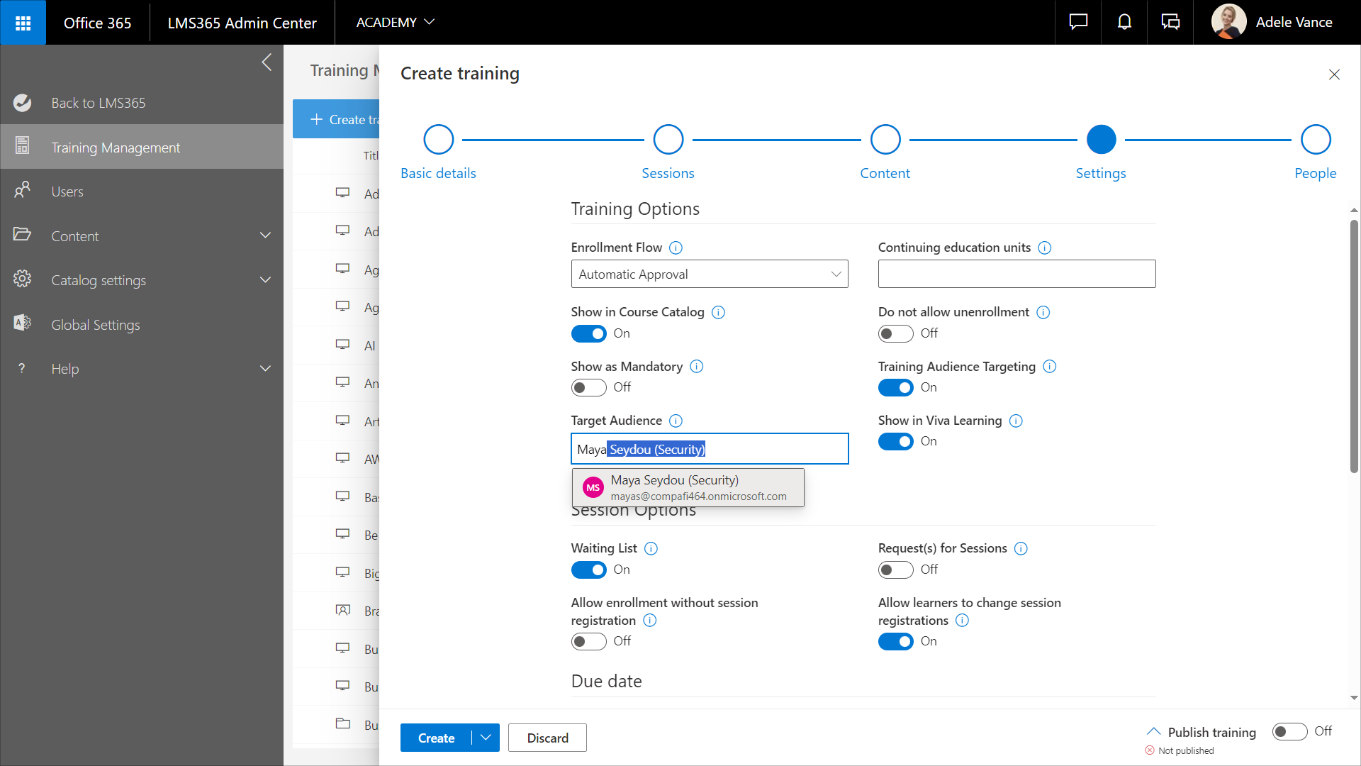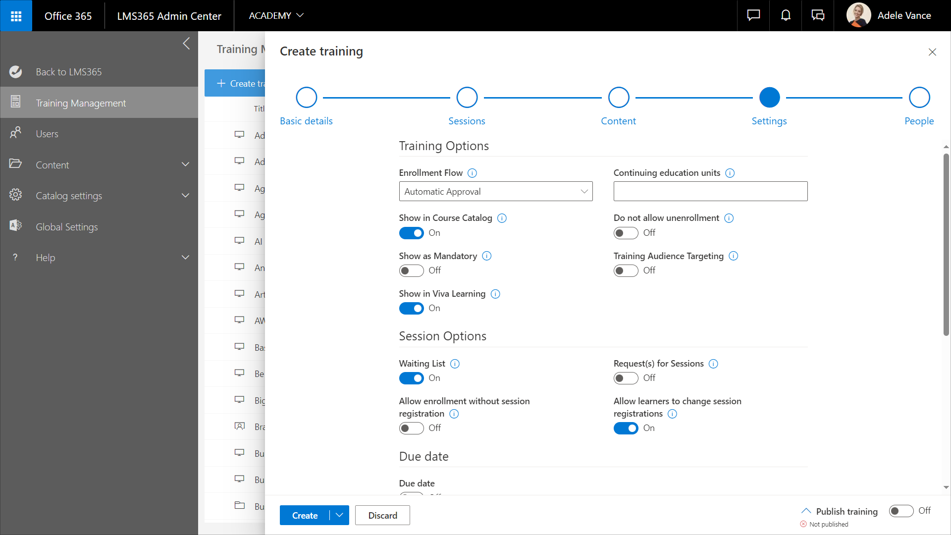 Zum Erstellen einer veranstaltungsbasierten Schulung wählen Sie Learn365 Admin Center > Schulungsverwaltung > Schulung erstellen aus.
