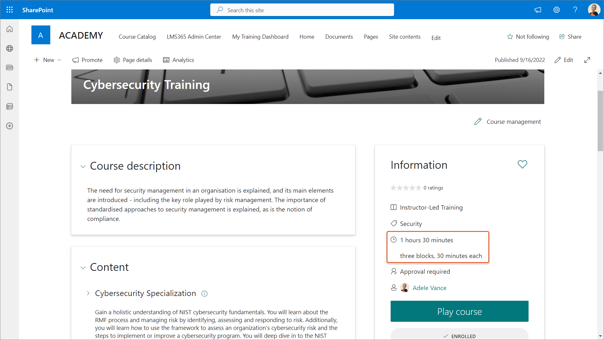 Die Dauer wird auf der Startseite des Kurses und auf der Schulungskarte des Kurskatalogs angezeigt. Geben Sie die Dauer des Kurses an, beispielsweise „ca. 2 Stunden“ oder „zwei Sitzungen à 1 Stunde“.
