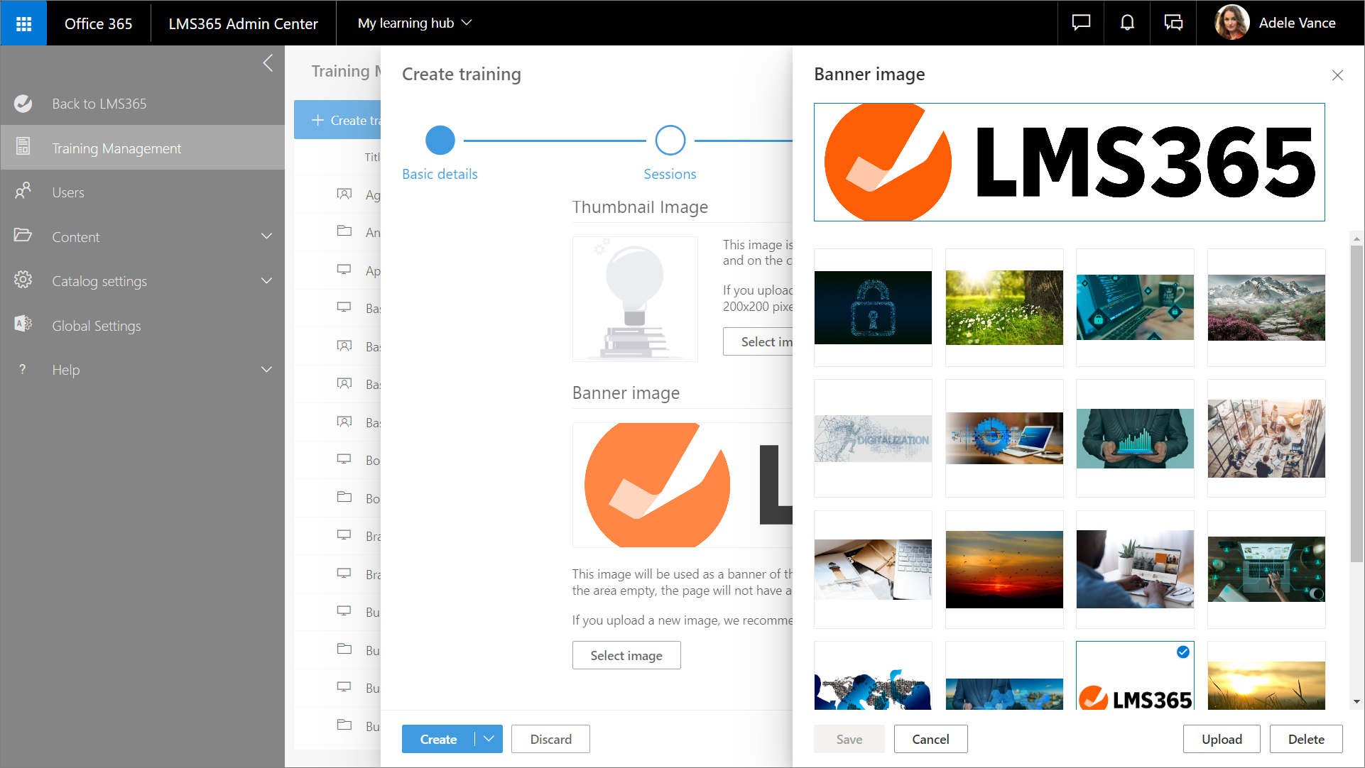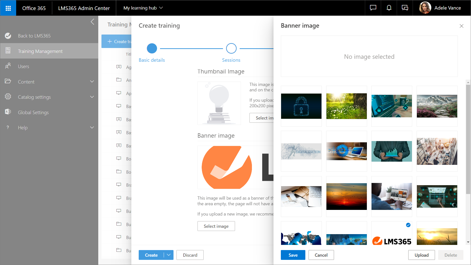 Ein Standardbild kann vom Kurskatalogadministrator unter Learn365 Admin Center > Katalogeinstellungen > LMS-Konfiguration > Schulungsbannergrafik festgelegt werden. Es wird automatisch auf alle neuen Kurse und Schulungspläne im Katalog angewendet. Wenn keine Standardbannergrafik festgelegt ist, wird für Kurse und Schulungspläne im Katalog kein Standardbild verwendet.