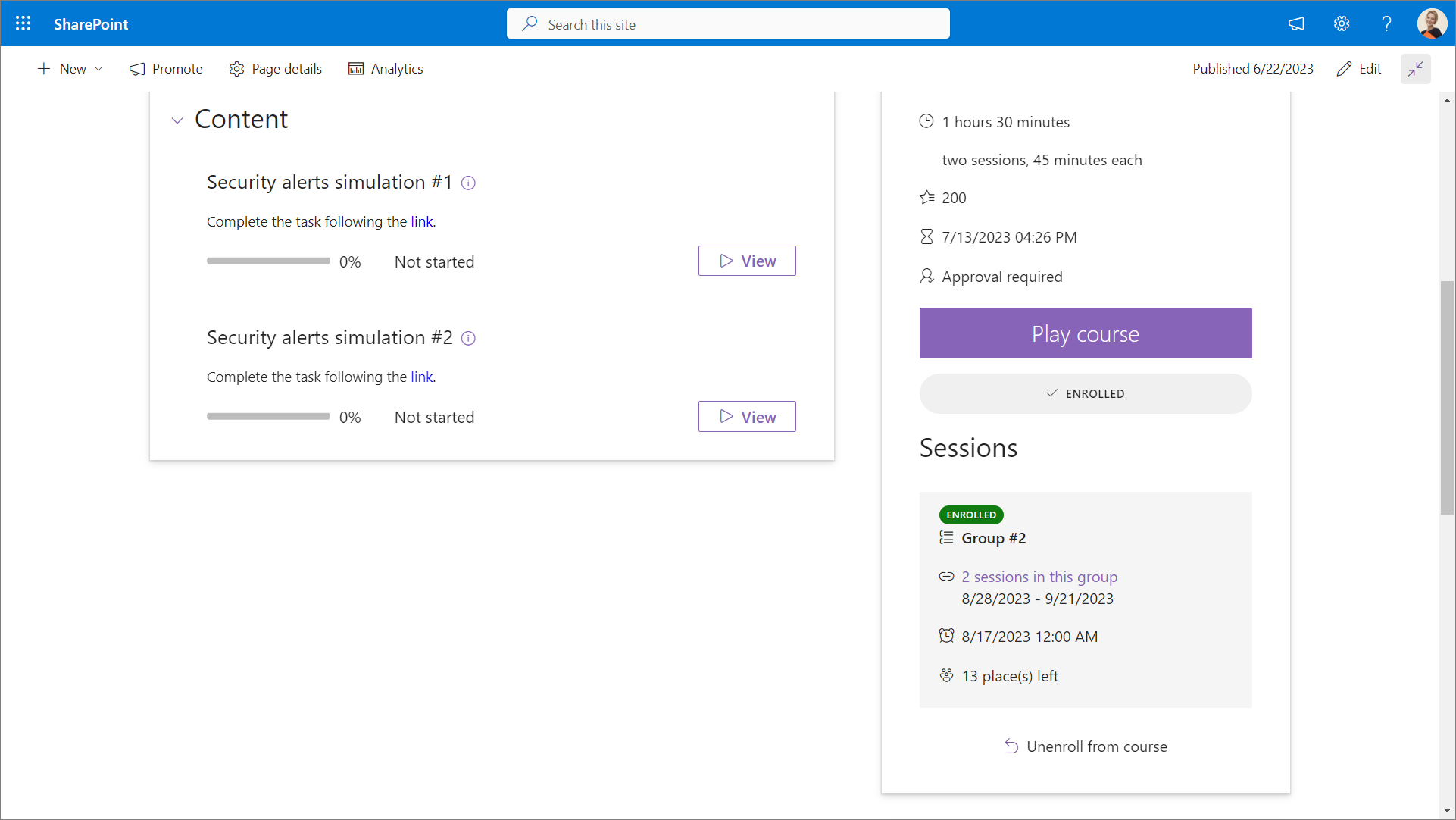 - Veröffentlicht. Für den Kurs ist die Option Schulung veröffentlichen aktiviert (Ein), und es sind entsprechende Start- und Endzeitpunkte angegeben. Der Kurs wird im Katalog angezeigt.