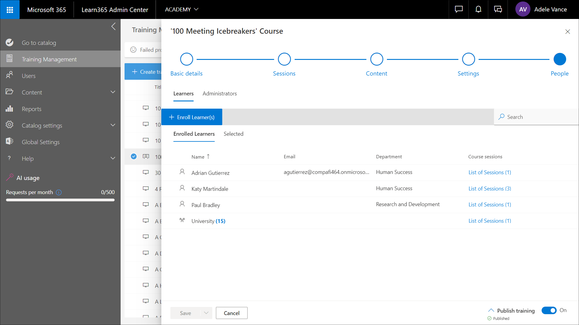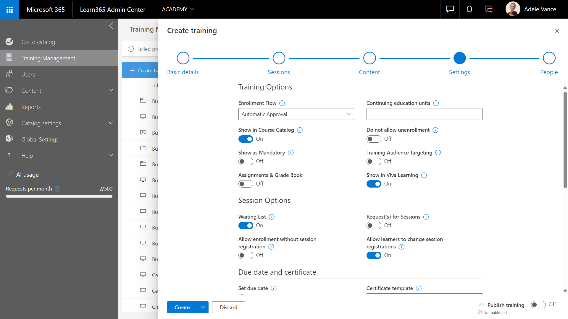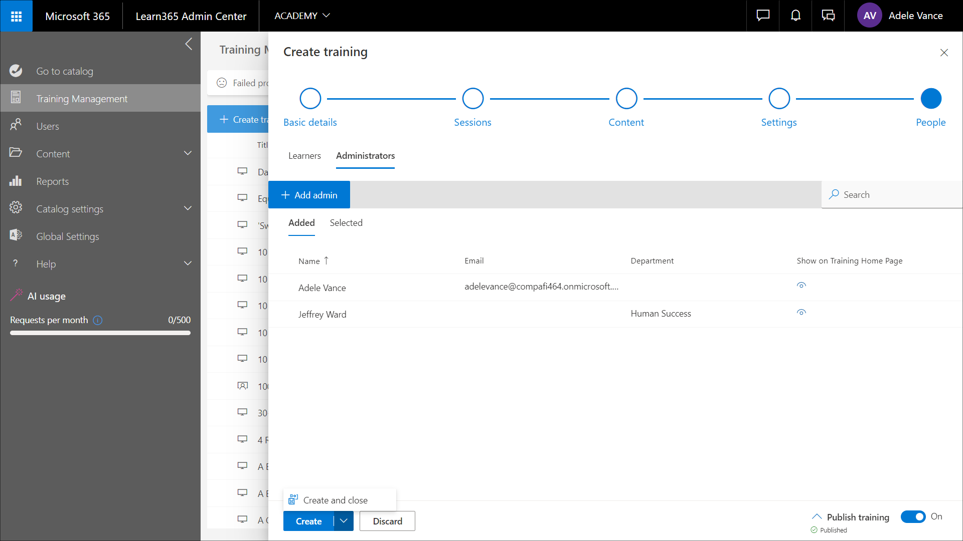 - Erstellen und schließen. Bei Auswahl von Erstellen und schließen wird der Kurskonfigurationsbereich geschlossen. Die Bereitstellung des Kurses erfolgt nun im Hintergrund. Sie werden zum Bereich Schulungsverwaltung im Learn365 Admin Center weitergeleitet.