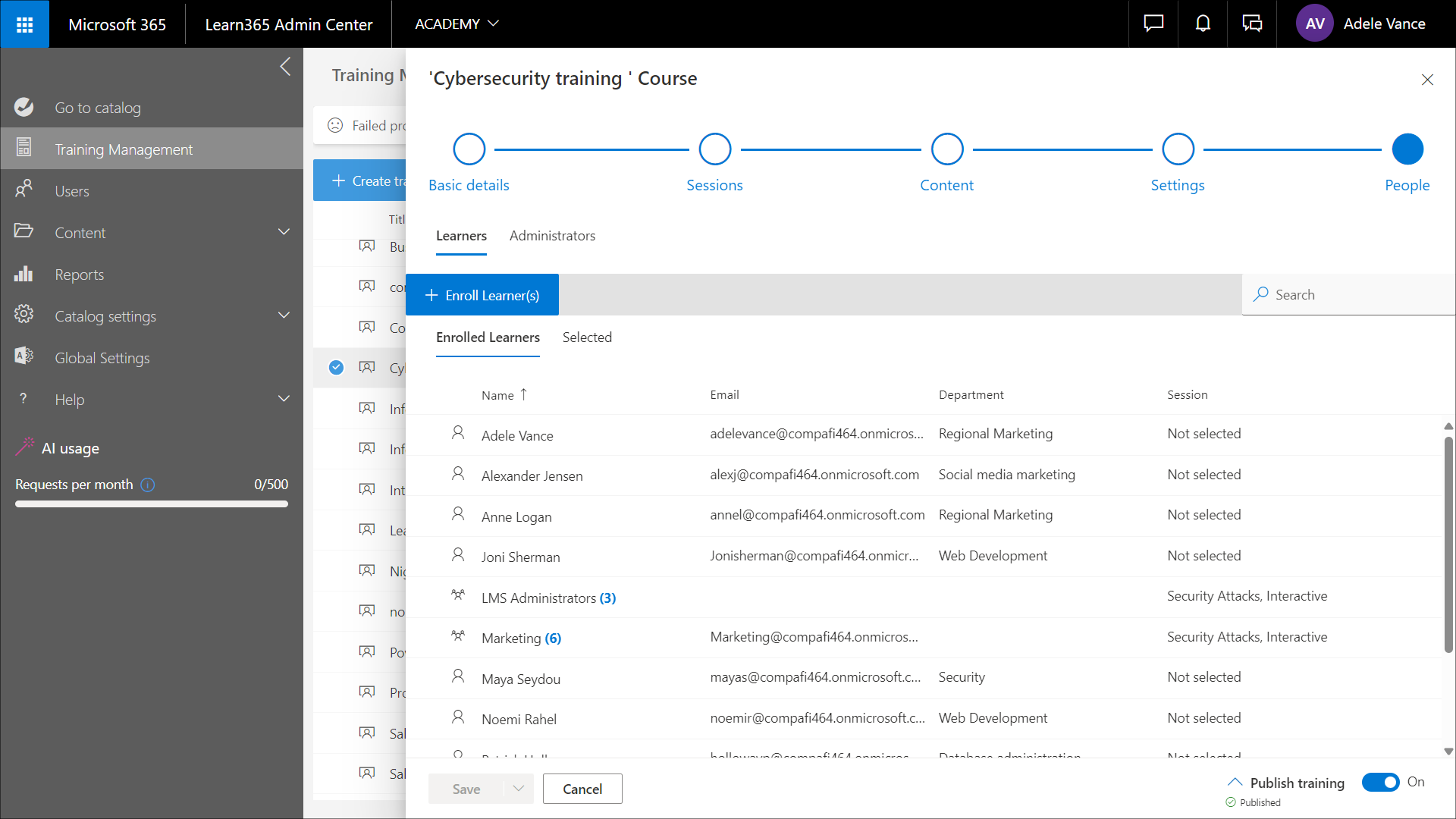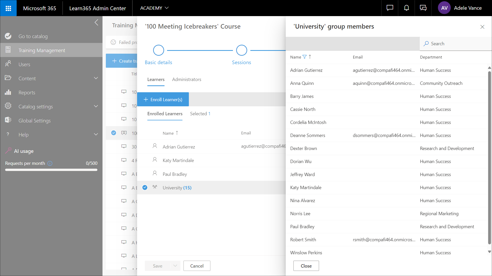 Katalogadministratoren behalten ihren uneingeschränkten Zugriff auf die Kursverwaltung. Daher werden ihnen auf der Seite Schulungsverwaltung auch weiterhin alle Kurse und Schulungspläne angezeigt.
