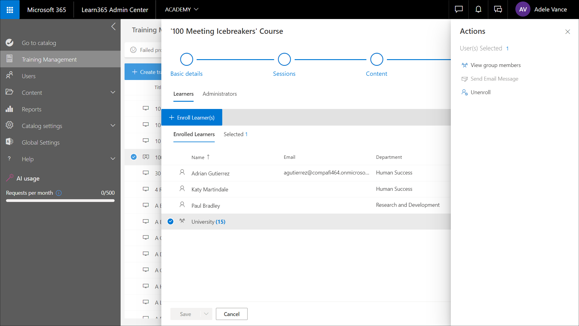 Nicht ausgewählt erscheint in der Spalte Sitzung für die im Kurs registrierten Lernenden oder Microsoft Entra-Gruppen (vormals Azure Active Directory-Gruppen), die über den Bereich Teilnehmer hinzugefügt und noch nicht in einer Sitzung oder einer Sitzungsgruppe registriert wurden. -